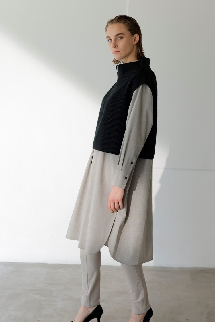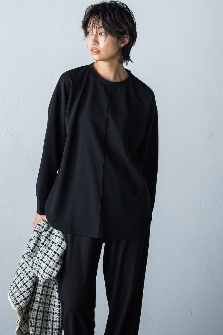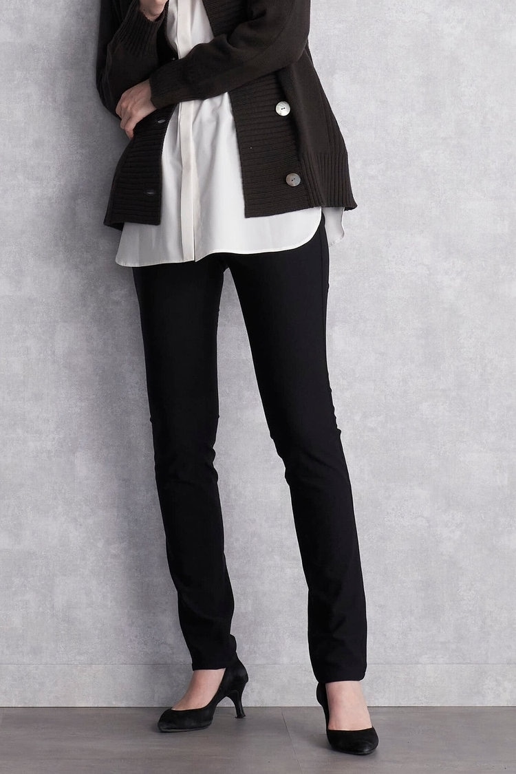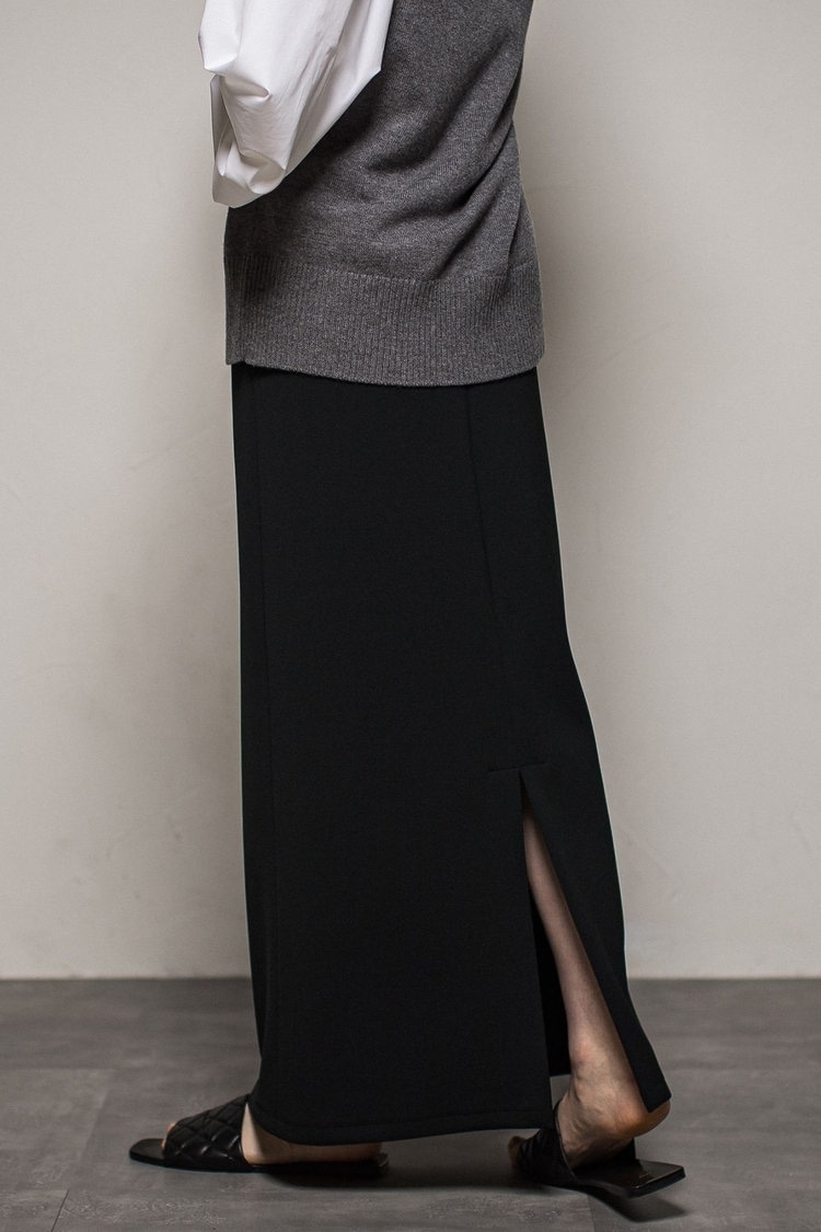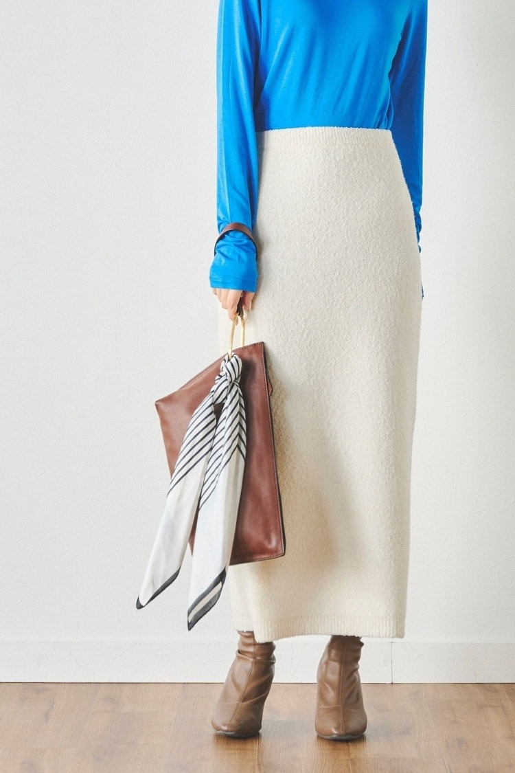 ミニマルなタイトシルエットが美しいIラインスカートは、サイドベンツ入りで抜け感がある使用。後ろウエストはゴム仕様、ややハイウエストに仕立てられているので、ラクに着られてスタイルアップ見えも叶います。冬におすすめなのが、クルーネックニット&カーディガンのアンサンブルトップスとのスタイリング。ベージュ×黒の上品カラーで、大人の女性らしさを引き出してくれます。足元は白のローファーを合わせ、抜け感を出して。