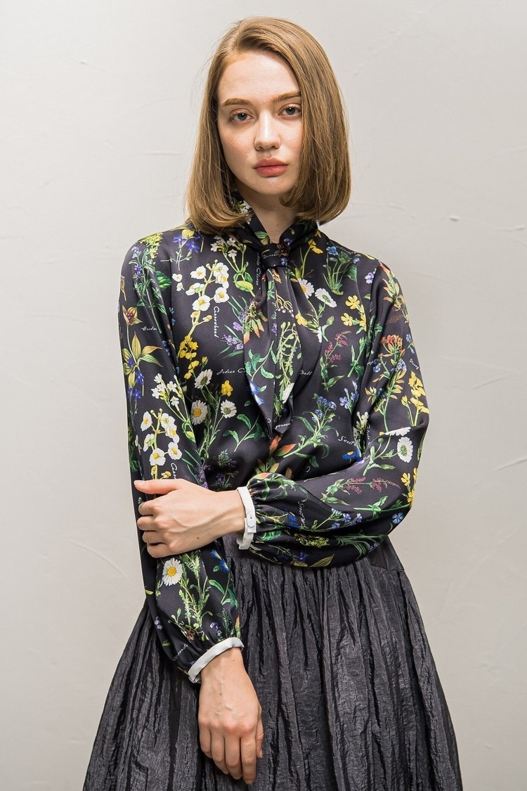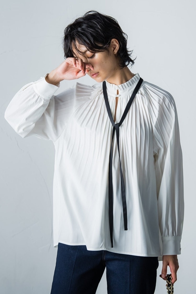 首から胸元、袖にかけての細かなプリーツが美しいブラウスは、トレンドのクラシカルなスタイリングにもマッチするアイテム。品よく華やかな雰囲気を作ってくれるから、40代女性にこそ取り入れてほしい逸品です。襟元のボタンは留めても、外して着てもOK。襟元でブラックの配色タイを軽く結べば、甘辛MIXなスタイリングが楽しめます。ボトムスはデニムですっきりカジュアルダウンしたら、フラットパンプスやミニバッグでシックにまとめて。