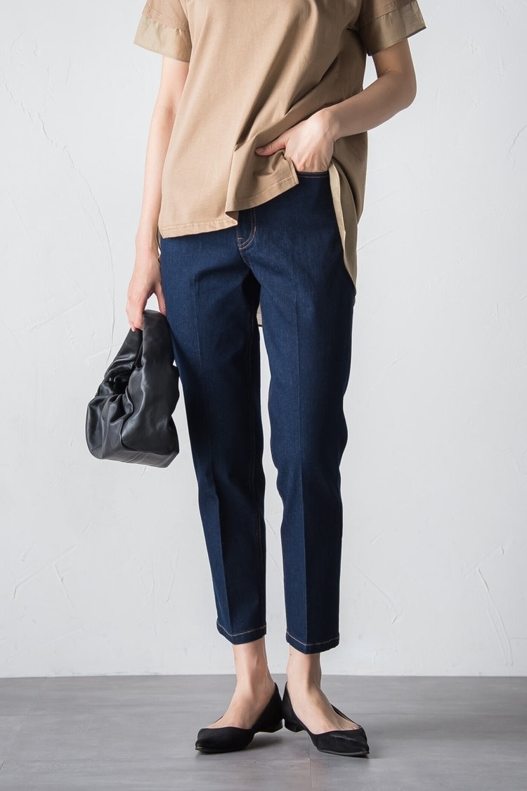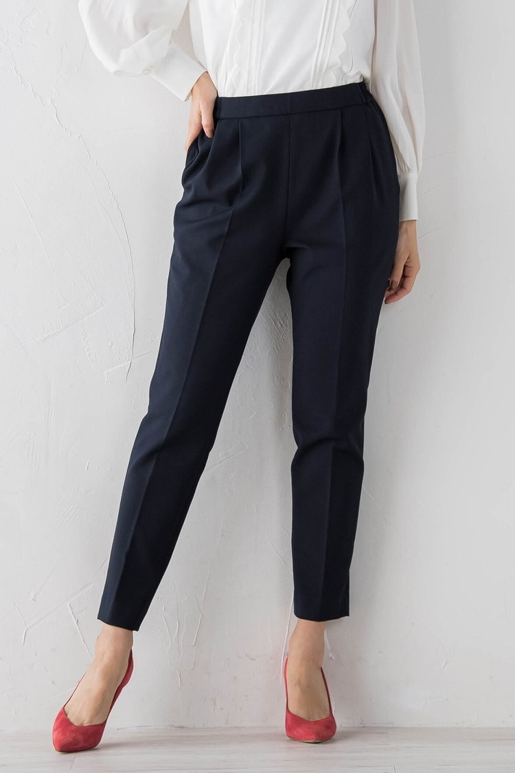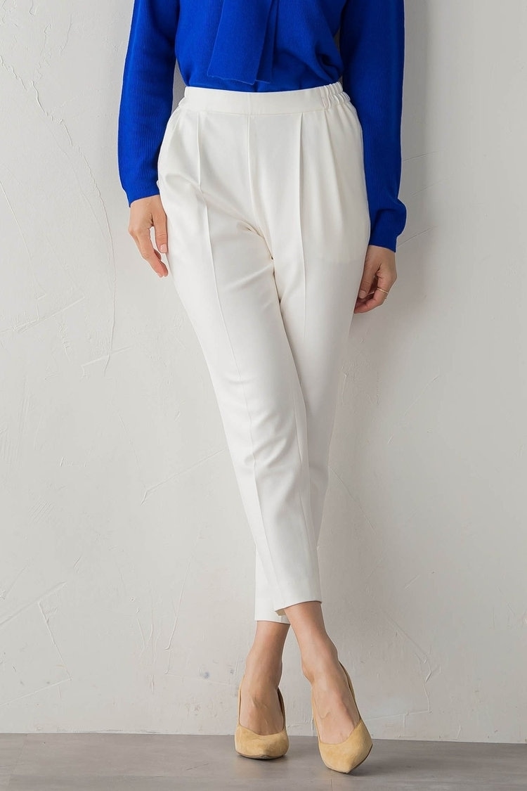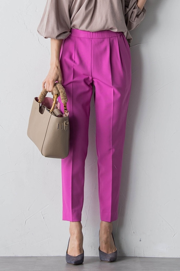 裾に向かって細くなるテーパードシルエットのパンツは、40代の冬コーデにも活躍してくれるアイテム。センタープレスのおかげで美しいレッグラインに見せられるのもうれしいポイントです。ブラウスやニットとのワンツーコーデも素敵だけれど、トレンドをより意識するなら、ボリューム感のあるツイードジレを合わせてみて。ジレのボリューム感とパンツのコンパクトさのバランスを意識すれば、今年っぽい大人フェミニンスタイルに仕上がります。