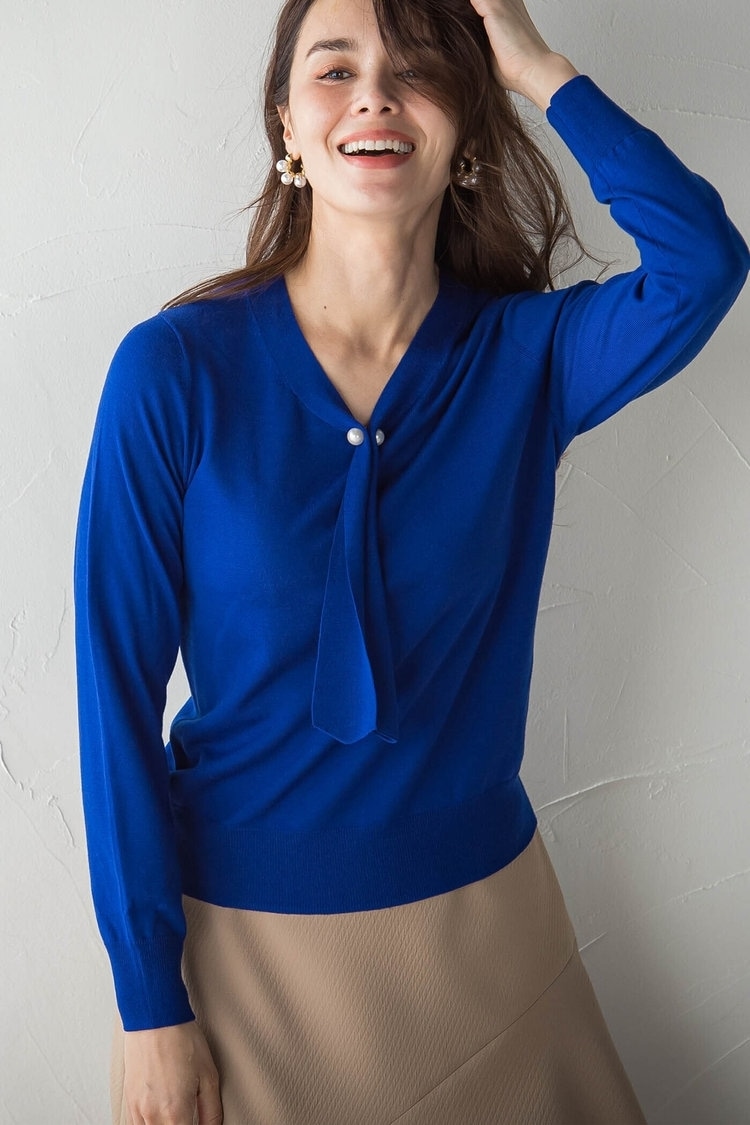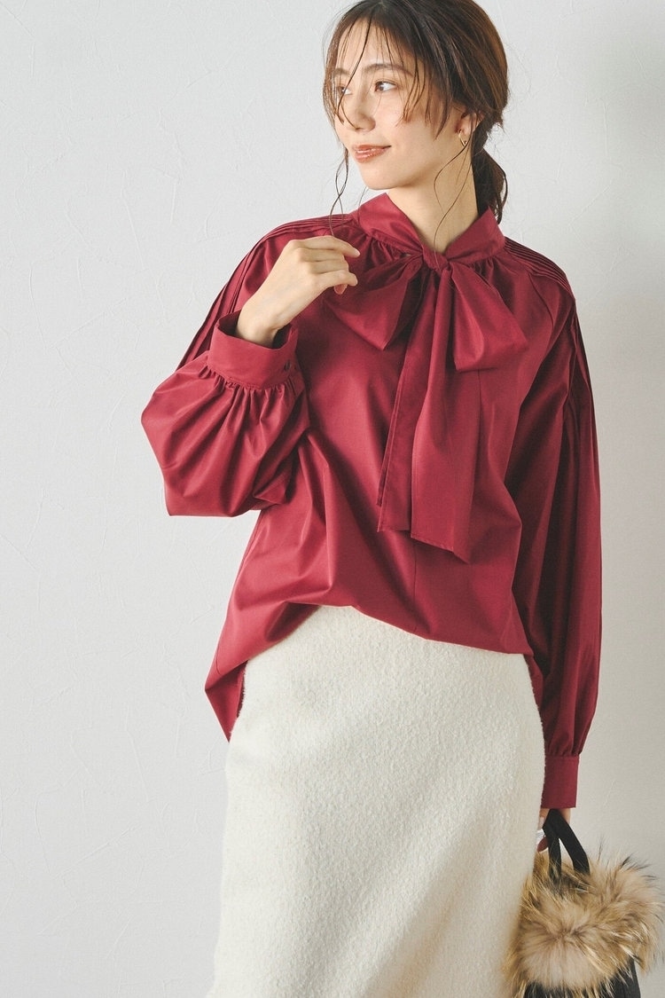 胸元の大きなリボンが大人可愛いデザインブラウスは、フェミニンカジュアル派におすすめのアイテム。深みのあるボルドーカラーなら、より華やかで女性らしいスタイリングが楽しめます。この冬おすすめの着こなしは、起毛感のあるIラインニットスカートとのコーデ。全体的にストレートなシルエットに仕上げることで、野暮ったい印象にならずすっきりとした雰囲気に仕上がります。小物類はレザーやファーなどで冬らしさを意識して。