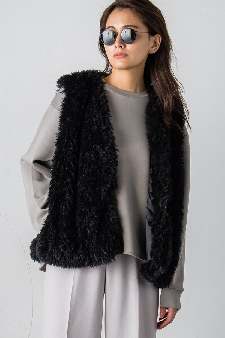 40代女性が冬のトレンド「ファージレ(ベスト)」を取り入れるなら、モノトーンカラーがおすすめ。どんな色の服にも合わせやすく、こなれた雰囲気の着こなしが楽しめます。ライトグレーのトップス&ワイドパンツのワントーンコーデには、黒のファージレをオン。ジレはVネックデザイン&長すぎない丈感なので、ボリューミィながらもすっきりとした印象に仕上がります。足元は黒のヒールブーツで仕上げ、モードな雰囲気のスタイリングに。