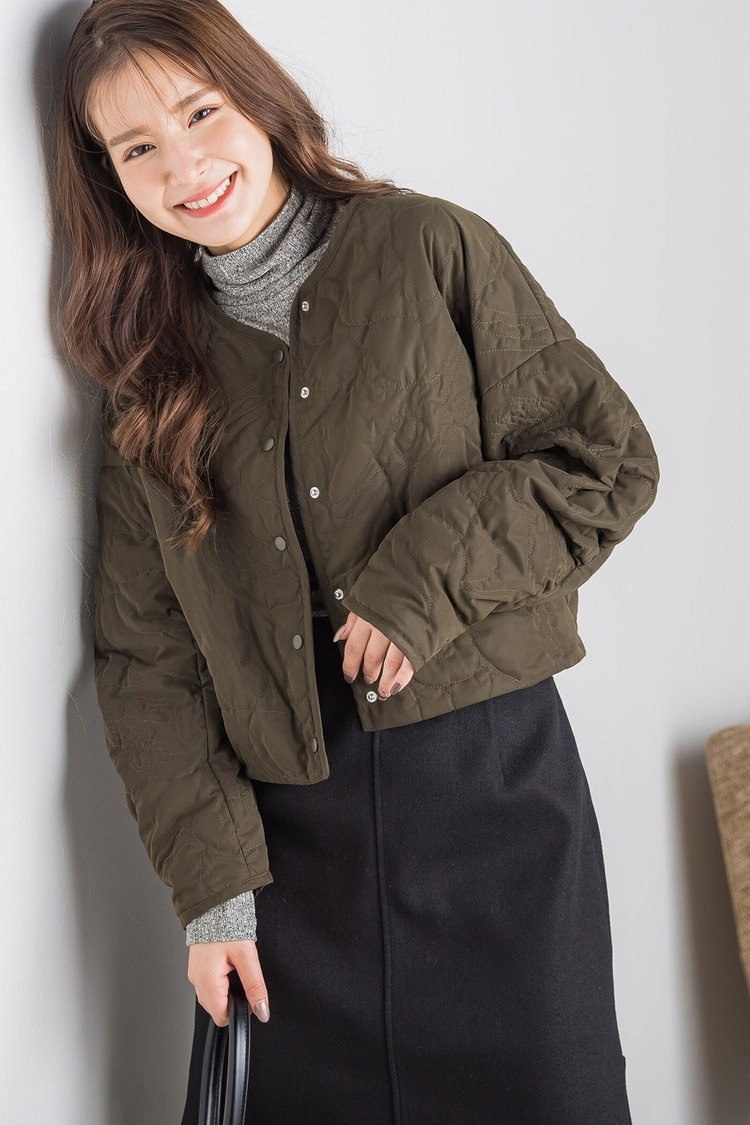 2022年冬のトレンドである「キルティングジャケット」を使ったコーデ。キルティングはカジュアルなコーデで活躍するけれど、丈感やサイズ感によっては生活感が出がち。コンパクトな丈感のものを選べば、すっきりおしゃれなスタイリングに仕上がります。さらに、ベージュグレーのタートルカットソー、黒のタイトマーメイドスカートできれいめにまとめるのがポイント。ブーツやレザーバッグなど、とことんレディな組み合わせを意識して。