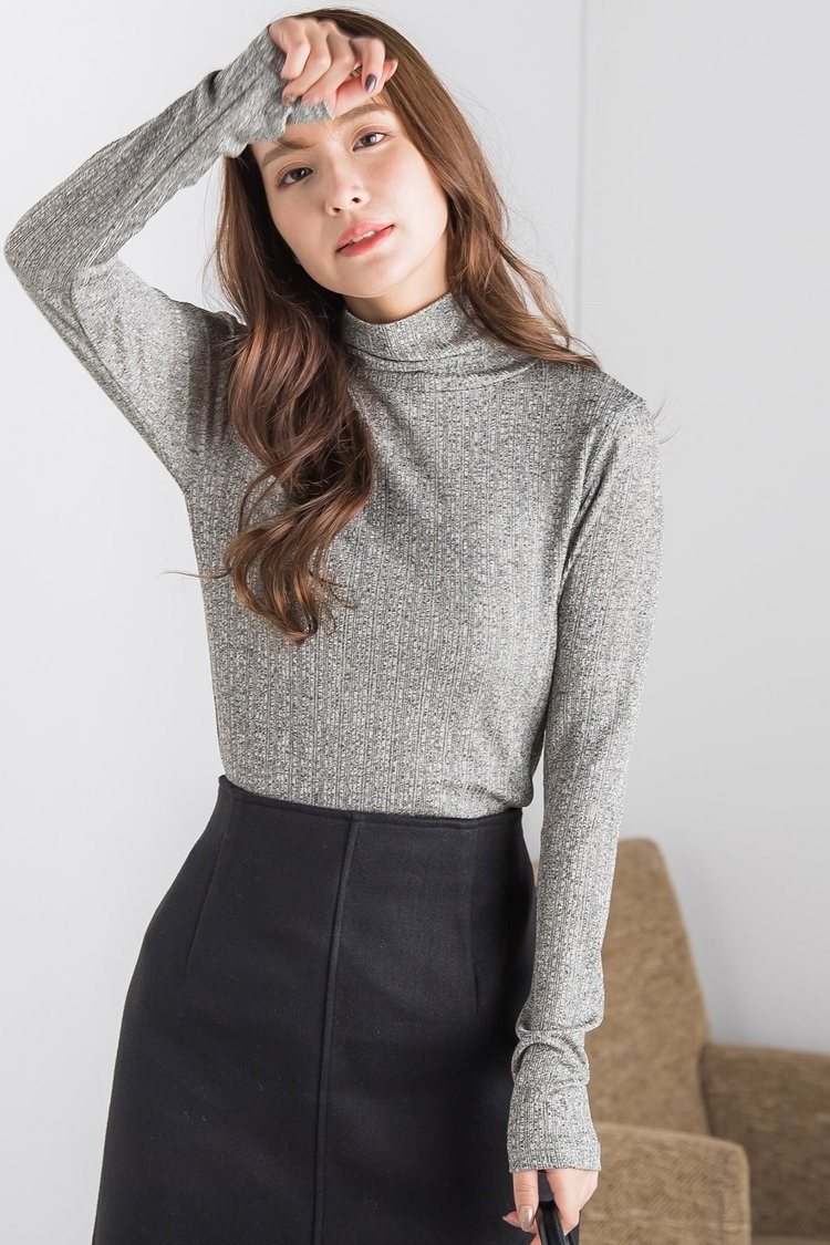 ベージュのタイトリブニットを使ったスタイリングは、フェミニン好きな40代女性におすすめ。ボディラインを美しく見せてくれるシルエットやほどよいハイネック、さりげないラメ感で、女性らしい雰囲気のスタイリングに仕上がります。コーデに取り入れやすいプチプラなのもうれしいポイント。ニット以外は黒で統一し、ニットをスカートINすることでシック&上品な雰囲気に仕上げられます。足元はタイツを合わせて、防寒&上品に仕上げて。