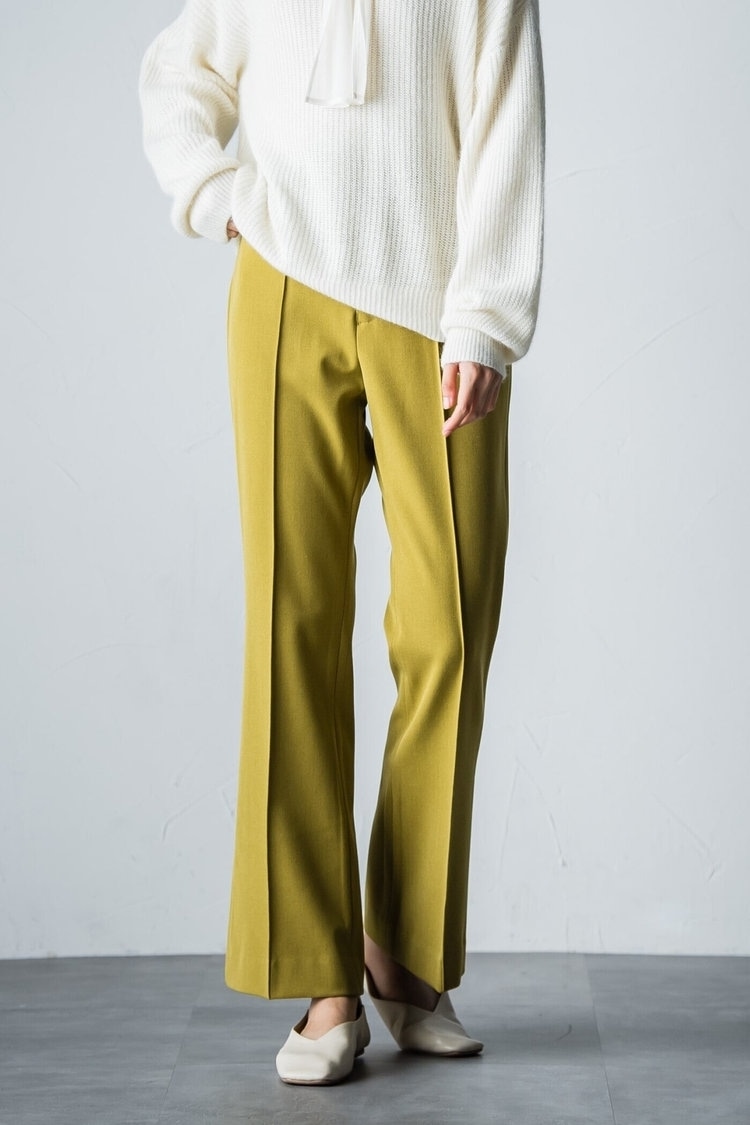 美脚見えを目指したい40代女性におすすめなのが、フレアパンツを使ったコーデ。ゆるやかなフレア&センタープレスで、脚を細く長く見せてくれます。この冬はベーシックなカラーだけでなく、落ち着いたカラーにも注目。ダークイエローなら、グレーやホワイト、黒などの出番が多いカラーアイテムとも相性ばつぐんです。ブラウス&ニットのレイヤードスタイルに投入すれば、ぐっと垢抜けた印象の冬コーデに。グレーのアウターを羽織って防寒対策もぬかりなく。