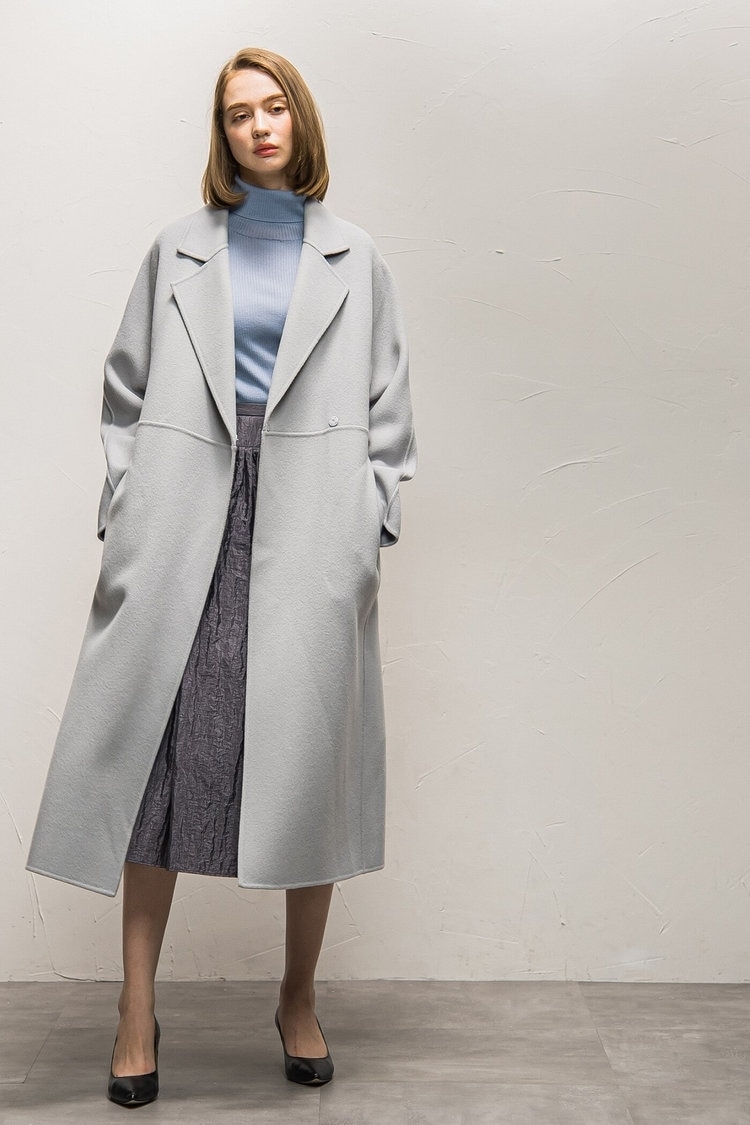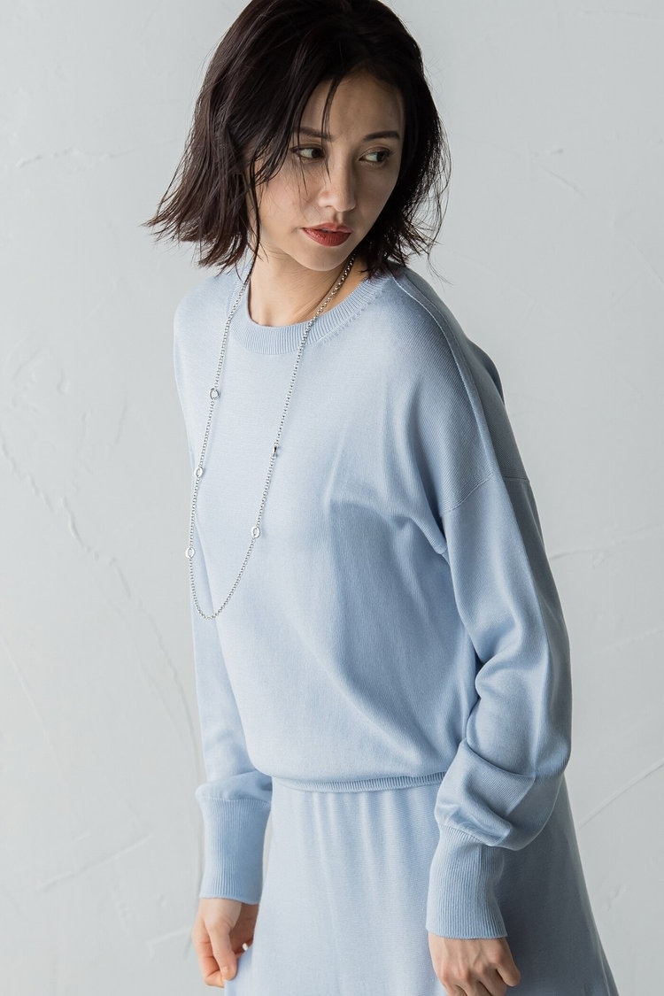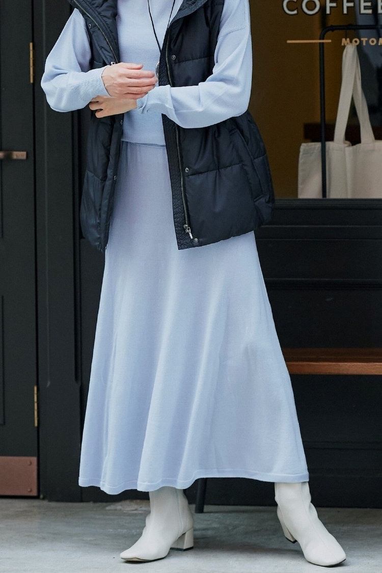 冬のフェミニンスタイルにおすすめなのが、ニット素材のフレアスカート。ゴム仕様のウエストに加えて吸湿発熱性、静電気防止などの機能も併せ持っているので、足さばきもよく、寒く乾燥する冬でも快適に過せます。同素材のトップスと組み合わせれば、ワンピース感覚で着られるのも◎。ライトブルーと相性のいいグレーのアウターを合わせれば、都会的でスタイリッシュな雰囲気の冬コーデに。淡いカラーのブーツでクリーンな印象に仕上げて。