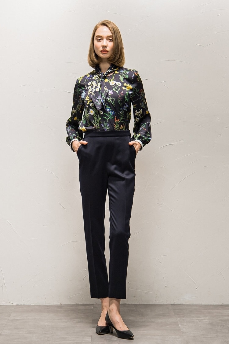 40代女性の大人らしさと美しさを引き出してくれる「サテン素材」。今年の冬は、サテンパンツをコーデに取り入れてみてはいかが?パンツは細めのテーパードシルエット、上品な光沢感のあるウールサテン素材で仕立てられていて、履くだけでエレガントな印象に。同じく光沢感&落ち感のある花柄ブラウスを合わせ、上質な着こなしを楽しんでみて。エレガントなスタイリングなので、ロングコートやジャケットなど、かっちりめなアウターがよく合います。