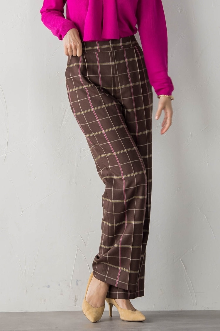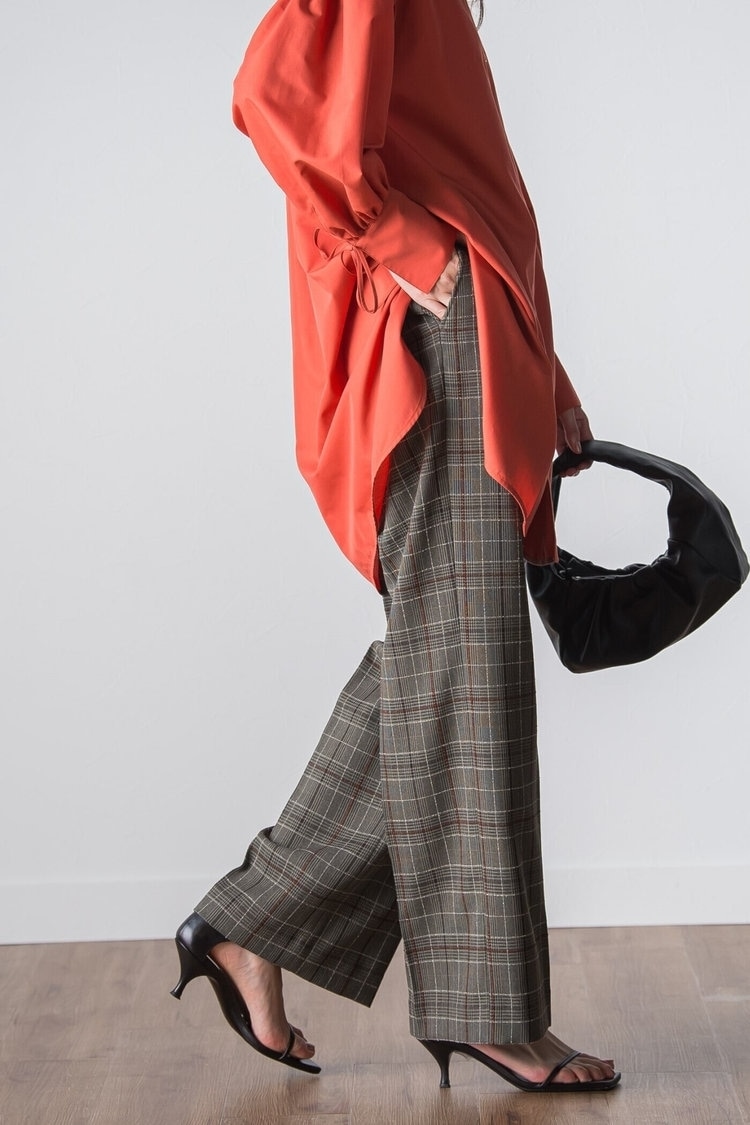 秋冬のマストともいえるのが、チェック柄のアイテム。グレーベースのチェック柄ワイドパンツは、クラシカルムード満点。トップスをインすると前フラップポケットが着こなしのアクセントになってくれます。普段のお出かけには、こっくり色のチュニックブラウスを合わせるスタイリングがおすすめ。きちんと感のあるパンツだから、ブラウスを出して着てもだらしない印象になりません。冬場は革のフラットシューズ、ブーツなどを合わせてもおしゃれに着こなせます。
