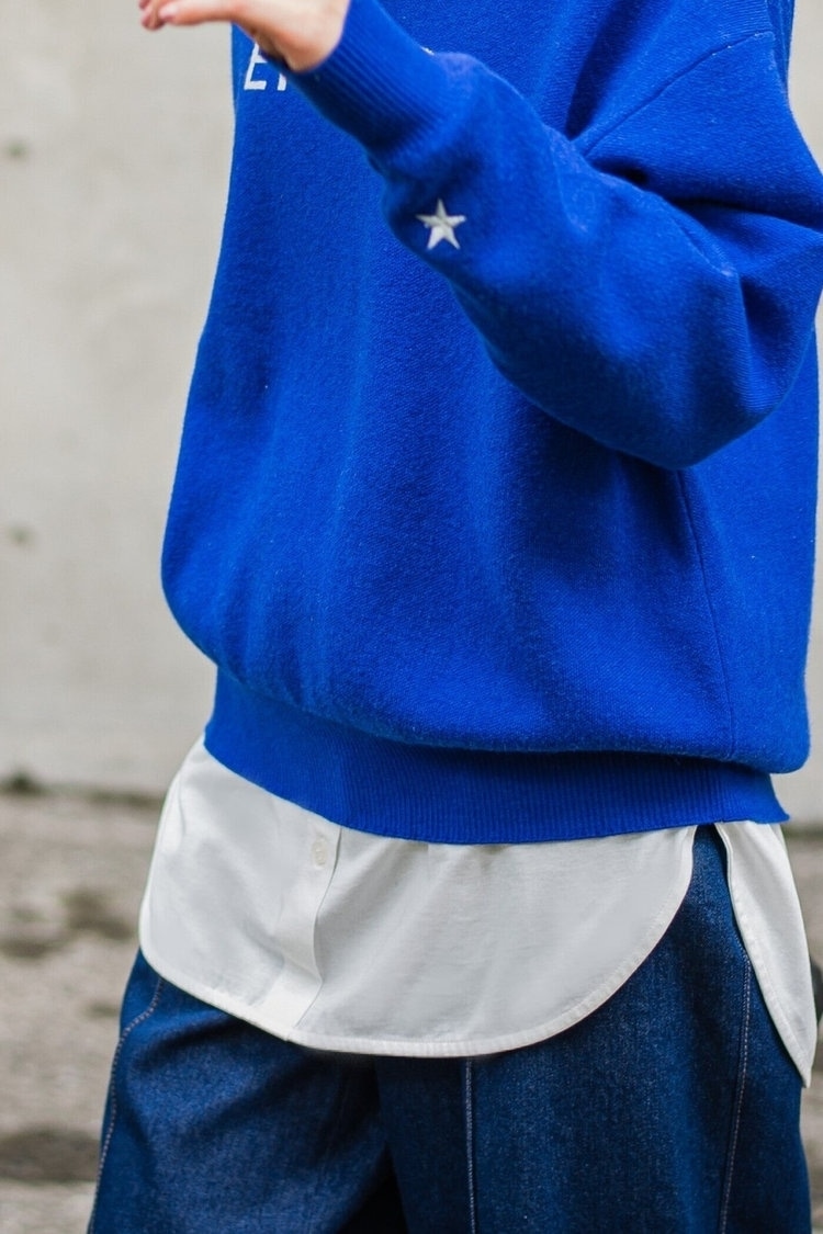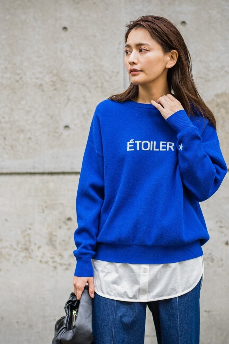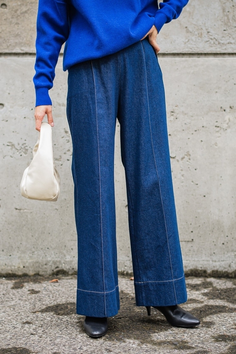 40代女性にもおすすめのワイドデニムパンツは、程よいハリ感とセンターライン仕様が大人っぽい。ロング丈なので、ヒールパンプスやブーツなど、冬に出番の多いシューズとも相性ばつぐんです。カジュアルな気分のときは、ブルーのロゴニット&シャツのレイヤードトップスを合わせるスタイリングがおすすめ。きれいめなデニムのおかげで、リラックス感がありつつ、きちんとした印象も与えられる大人らしいスタイリングに仕上がります。