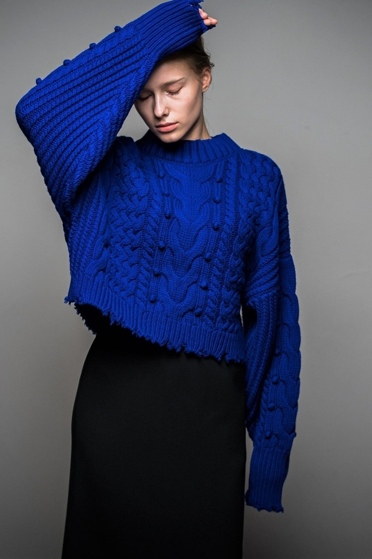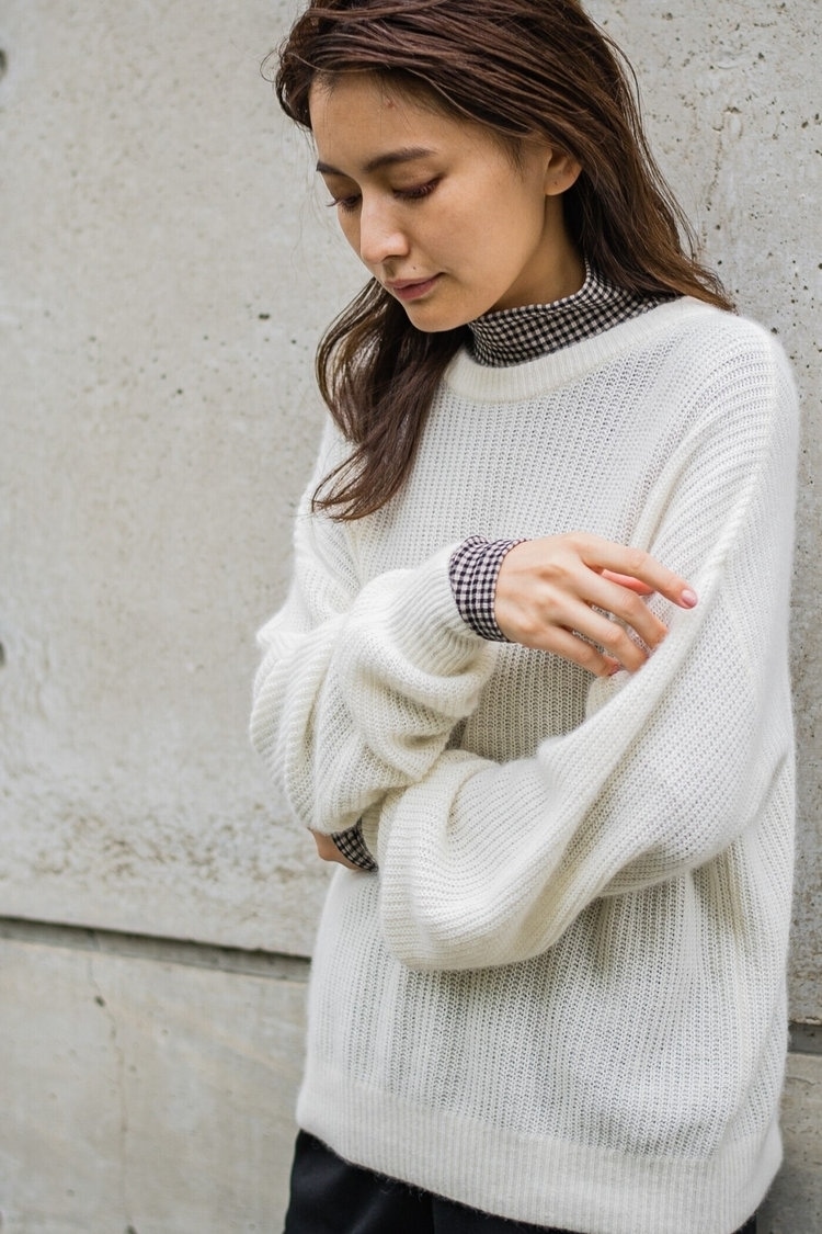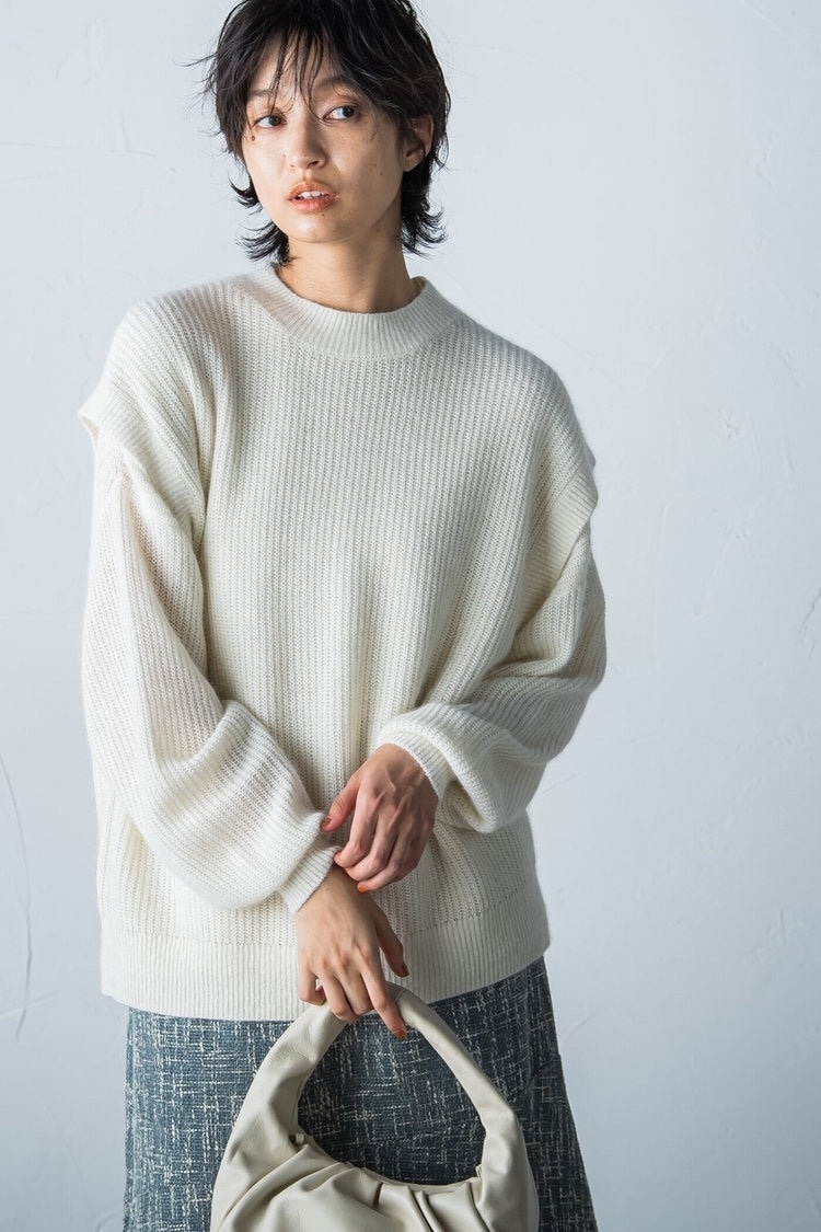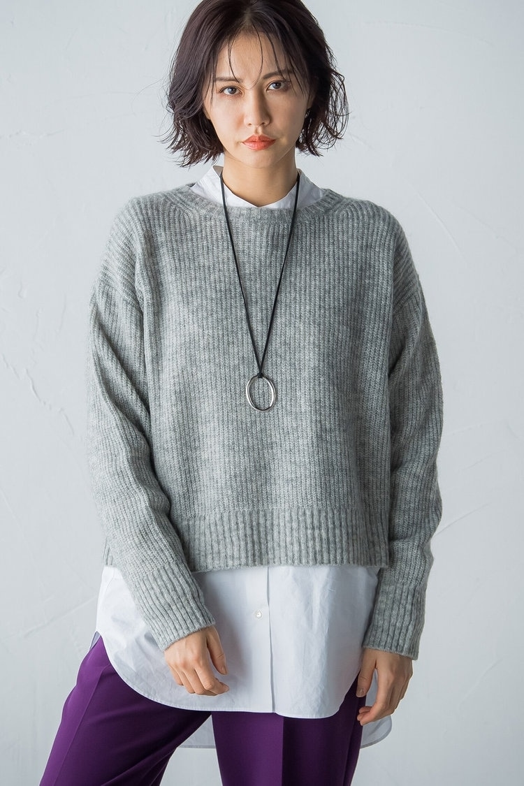 2022年冬に注目の「ショート丈ニット」は、手軽にトレンド感が楽しめるアイテム。アクセントになるカラーのニットがおすすめ。ウール100%で紡毛特有の軽さと膨らみを生かした、ハンドならではの凹凸のある仕上げが冬らしい雰囲気を作ってくれます。トップスに存在感があるぶん、ボトムスはシンプルにまとめるのがポイント。さらにファーバッグなどの小物で、季節感たっぷりのスタイリングに仕上げて。