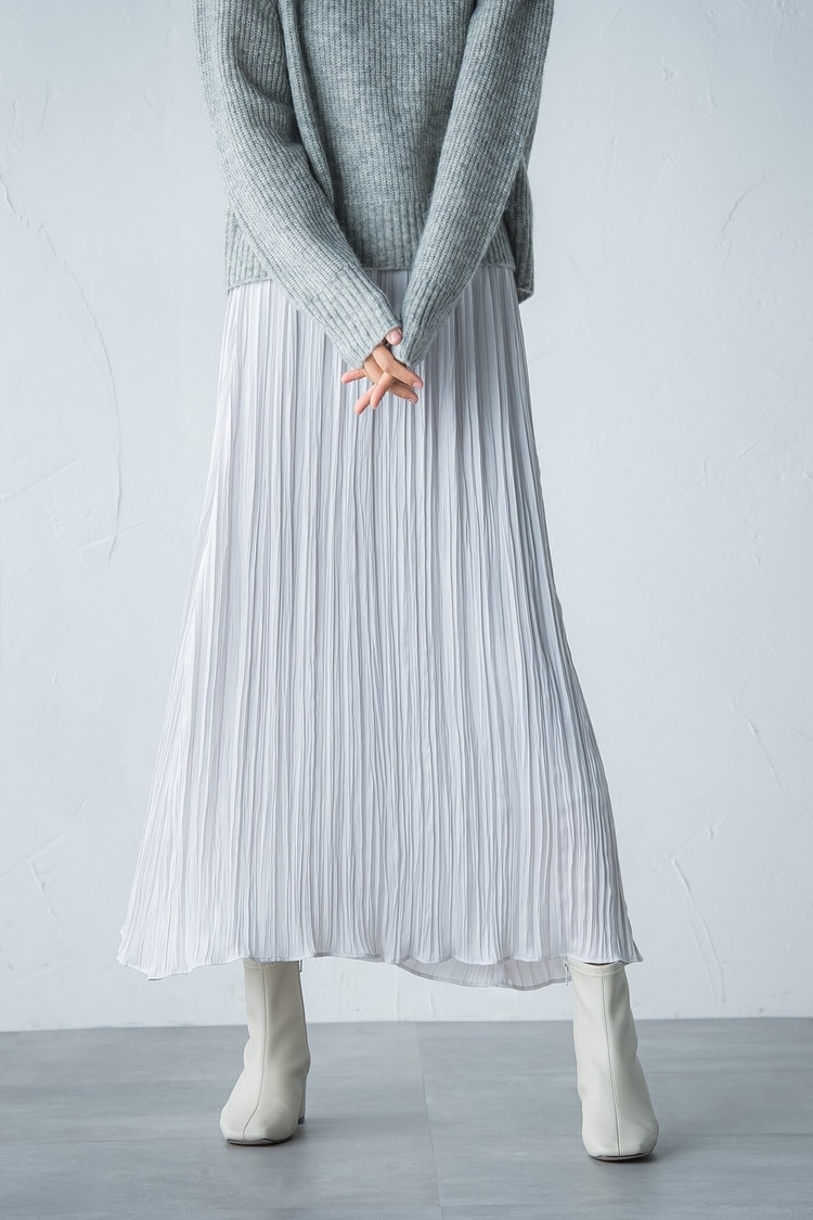 細かなプリーツが美しいプリーツスカートは、重くなりがちな冬の着こなしに軽やかさをプラスしてくれるアイテム。大人の女性の冬コーデにも取り入れやすく、繊細で上品な雰囲気のスタイリングが楽しめます。今年はグレーのクロップドニット×ライトグレーのランダムプリーツスカートで、ちょっぴりクールな雰囲気に仕上げるのがおすすめ。甘さを抑えつつ大人っぽさと女性らしさを兼ね備えたコーデが完成します。さらにアイボリーのブーツを合わせ、統一感のある冬コーデに仕上げて。