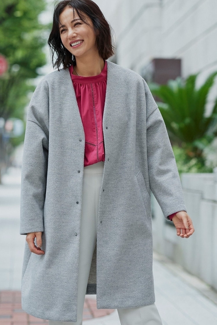 40代の冬のワードローブにあると便利なのが、羽織りやすく明るい印象になる淡いカラーのコート。ベージュのヘリンボーン柄なら、可愛らしくなりすぎず大人っぽく着こなせます。ゆったりとしたサイズ感や大きめの襟がかわいく、ばさっと羽織るだけで上品&クラシカルな雰囲気を纏えます。ホワイトのニットやブルーのパンツと合わせ、全体的に淡いトーンで統一すると、透明感たっぷりなスタイリングに。冬の淡色コーデを楽しんでみて。