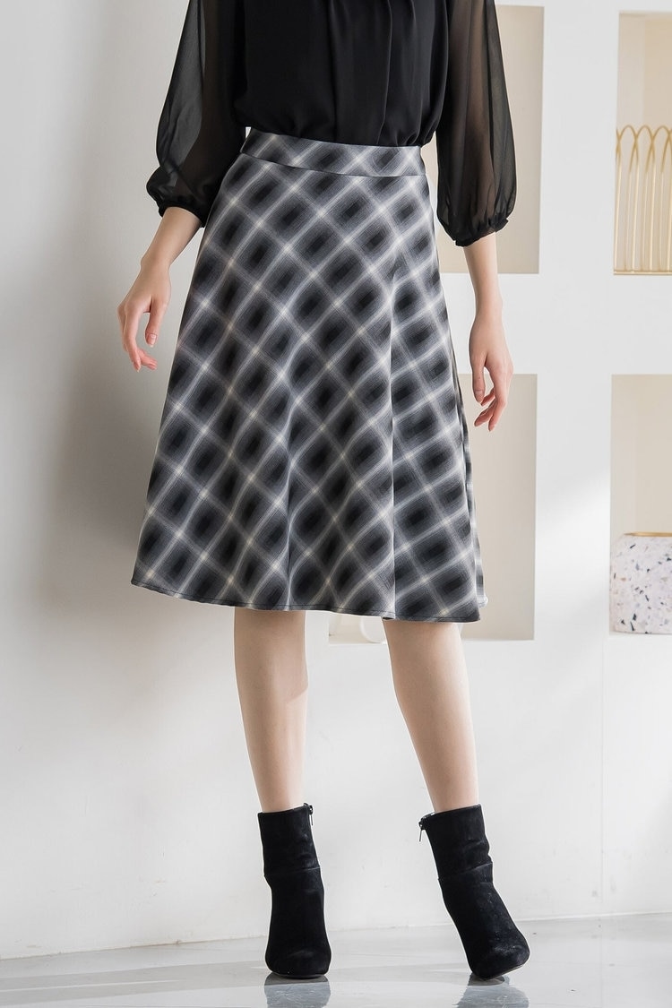 秋冬シーズンになると着たくなるのが、チェック柄のアイテム。フェミニン派の女性には、女性らしいフレアシルエットのチェックスカートがおすすめです。ブラックベースならどんな色のトップスとも相性よく、着回し力もばつぐん。合わせ方次第でオフィス、女子会、デートなどに幅広く活躍してくれます。シックに着こなしたいときは、使うカラーを抑えるのがコツ。ネイビーのニット+タイツ+エナメルパンプスでレディな雰囲気に仕上げて。