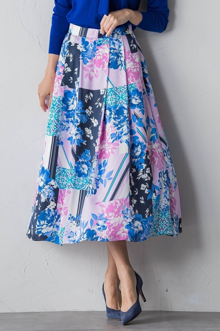 光沢感が美しいサテンは、2022年冬の注目素材。そんなサテン素材を使ったフレアスカートを選ぶなら、思い切って柄物にトライしてみて。ブルーとピンクを基調としたパネルフラワープリントが、暗くなりがちな冬コーデに明るさと華を添えてくれます。鮮やかで上品な色使いのパターンが存在感たっぷりで、シンプルなトップスに合わせるだけでグッと華やかなスタイリングに。スカートの存在感が強いので、足元や小物類はシンプルに仕上げるのがおすすめ。