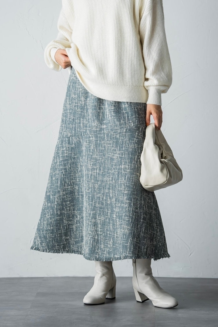 定番のマーメイドスカートはツイード素材で変化をつけて