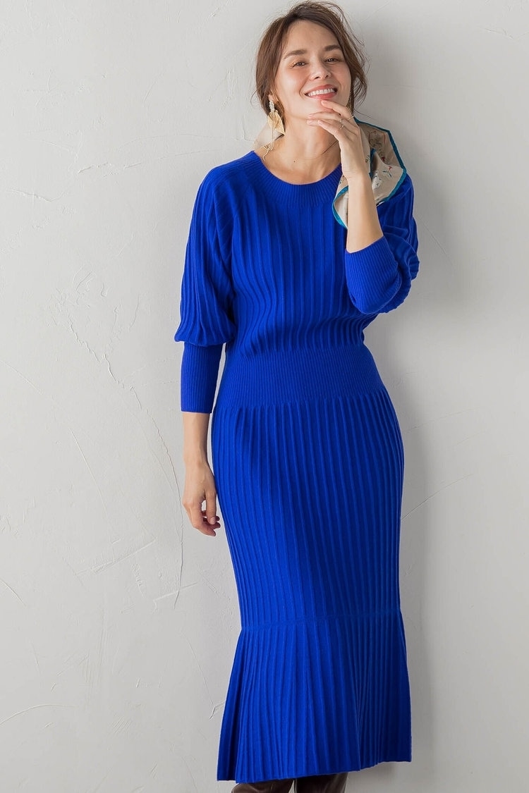 着るだけで女性らしいスタイリングが楽しめるニットワンピースは、40代女性におすすめのアイテム。ニットワンピースを大人っぽく着こなすなら、リブ編みのデザインにこだわってみて。総リブ編みのニットワンピースは、詰まった首元やパフスリーブがエレガントな印象。リブの縦長効果で、すらりと見せてくれます。さらにウエスト部分を細いリブ編みに変えているから、ウエスト位置が高く見えるのも◎。ワンピースがシンプルな分、ヒールブーツやスカーフ、ゼブラ柄バッグなどの小物使いで個性を出して。