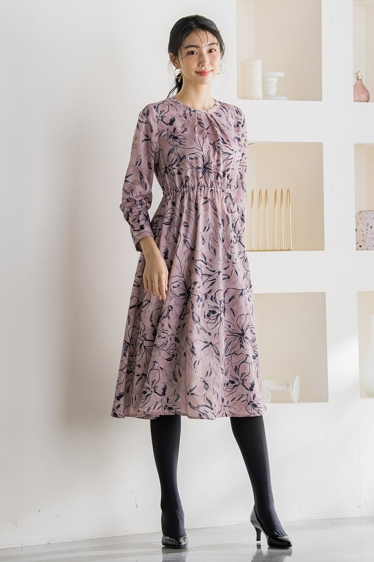 手書き風の花柄が美しいワンピースは、高めのウエスト位置にギャザーを入れているのがポイント。腰の位置が高く見え、スタイルアップ見えが叶います。すこしくすんだピンクなら、大人の女性でも着やすく、甘くなりすぎない雰囲気に。40代らしい大人の着こなしを楽しみたい場合は、足元にタイツをプラスし、肌見せの分量を調節するのがポイント。レディな雰囲気のワンピースに合わせ、ヒールパンプスでエレガントに仕上げてみて。