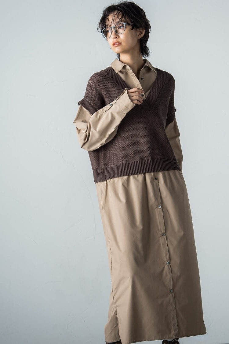 ゆったりとしたシャツワンピースは、大人カジュアル好きな40代女性におすすめのアイテム。2022年の冬は、トレンドのニットベストを合わせた着こなしがぴったりです。ジャガード編みのニットベストがドッキングしたワンピースなら、1枚だけでお手軽にトレンドコーデが楽しめますよ。足元はフラットシューズでも、ブーツでもきれいにまとまります。ワンランク上のカジュアルスタイルを楽しみたい人は、ワークブーツでちょっぴりハードなテイストをプラスして。