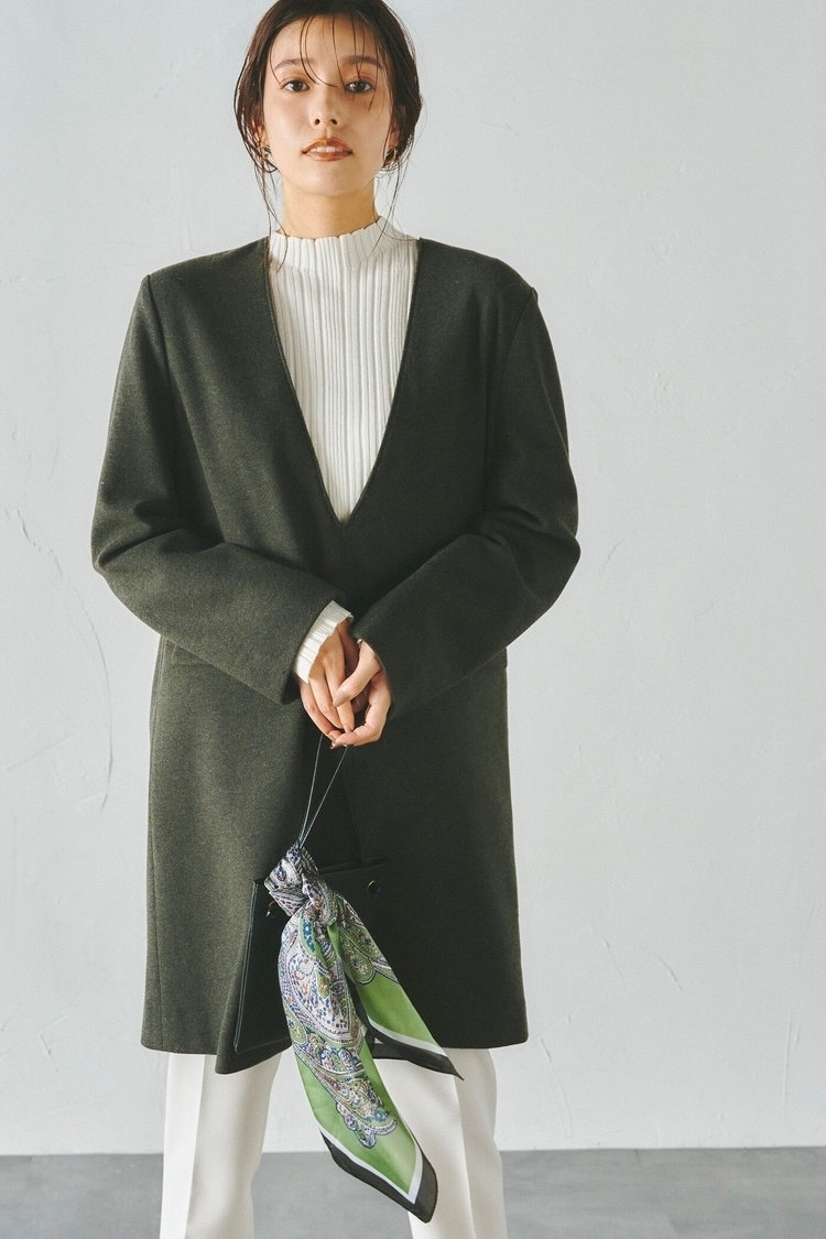 ボクシーなシルエット×深めのVネックが印象的なワンピースは、そのままでも、重ね着をしても着られる着回し力ばつぐんなアイテム。40代女子が着こなすなら、深みのあるカーキがおすすめ。そのままでは重い印象になりそうなら、インナーに白を合わせると◎。首元に白を持ってくることで顔周りを明るく見せてくれます。ボトムスも白のテーパードパンツで軽快に仕上げれば、抜け感のあるスタイリングに。グリーン系のスカーフでコーデにアクセントを加えて。