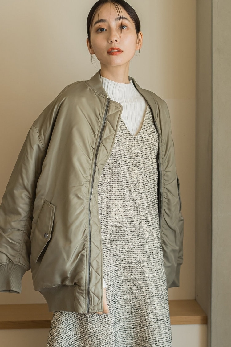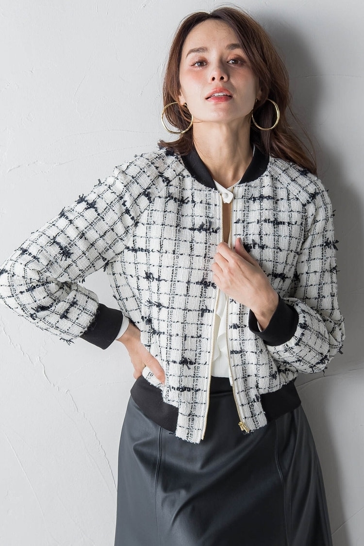 2022年冬の一大トレンド・ツイード素材を使ったジャケットも、ブルゾンにカジュアルダウンしてデイリーに大人が使えるデザインが新鮮。複雑で美しい色合いが特徴で、ツイードコーデで他の人と差をつけたい人におすすめのアイテムです。垢抜け見えを目指すなら、ボトムはフレアスカートやヒールパンプスで女っぽさをプラスするのがコツ。ジャケット以外はモノトーン&タイトにまとめることで、ジャケットの存在感が引き立ち、おしゃれなスタイリングに仕上がります。