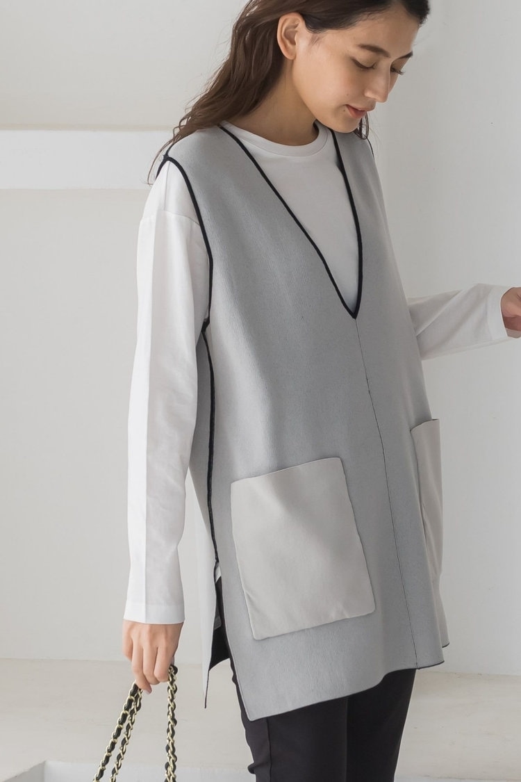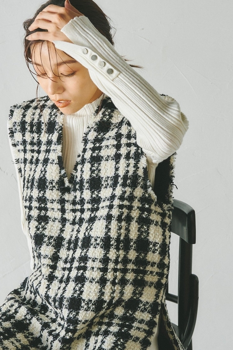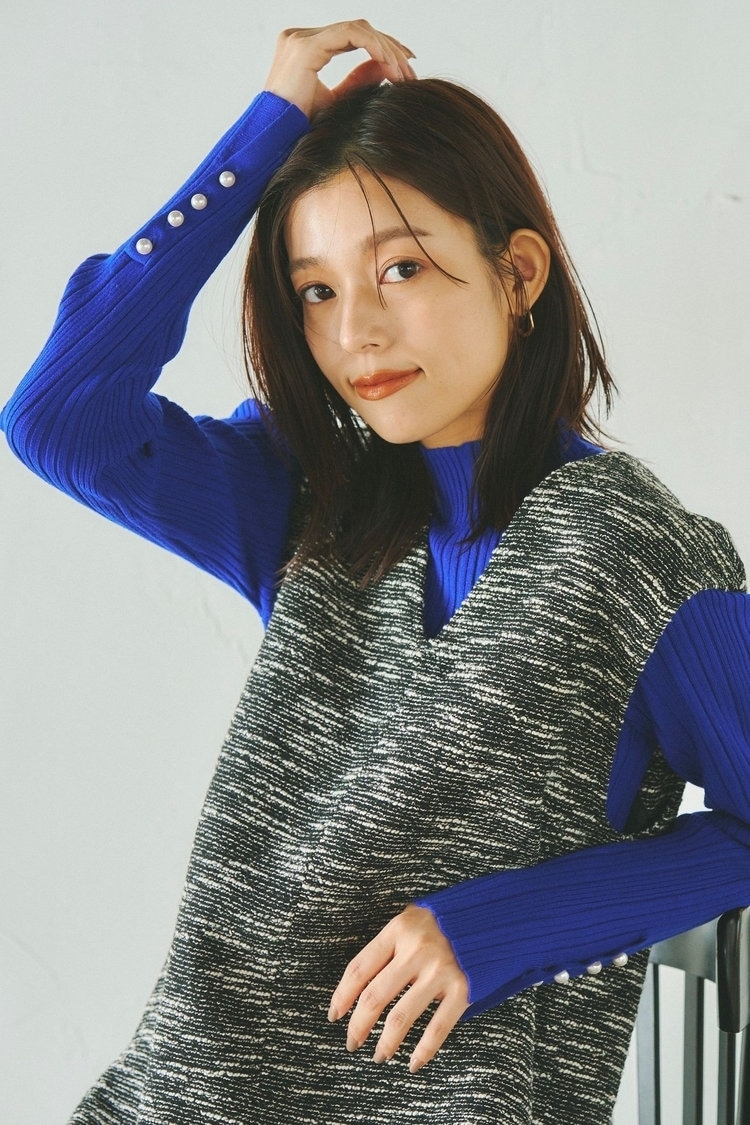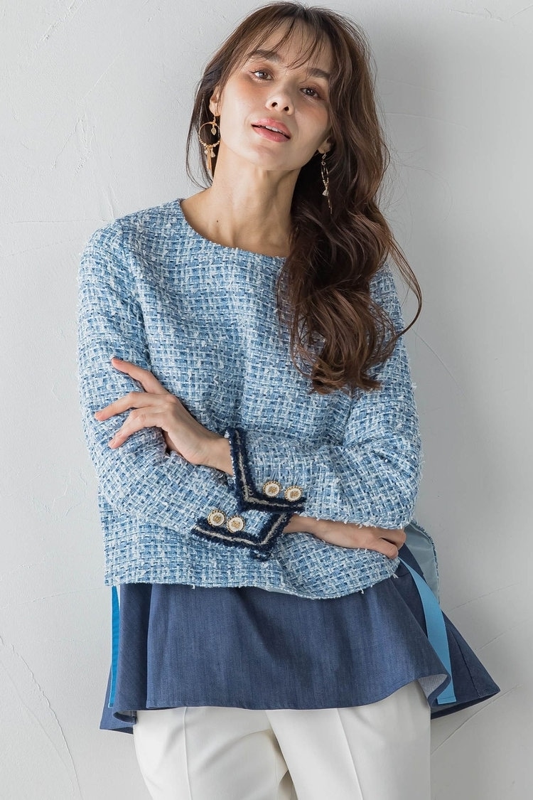 ミックスツイード素材は季節感もあり、少し厚めの素材なので冬に大活躍。暖色を選びがちな人もクールなブルー系を選んでみて。1枚でレイヤードしているようなデザインなのでコーディネートにプラスしやすいのもポイント。細身のパンツとコーディネートがしやすく、ホワイト以外にもブルー系のカラーパンツでコーディネートをまとめても◎。きれいめな印象なので、カジュアルスタイルにはもちろんオフィスコーデにもおすすめ。