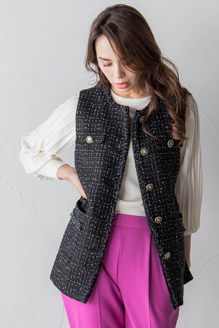 シンプルなテーパードパンツ×ツイードジレで華やかに