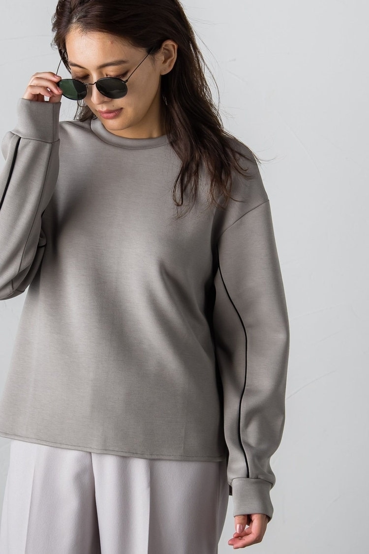 起毛感と上品な光沢のあるピーチサテンブラウスは、オンオフ問わず使えるアイテム。胸元のパール使いが着こなしにエレガントな華やかさを添えてくれます。肌なじみのいいベージュカラーなら、甘さを抑えつつも女性らしいスタイリングに。ベーシックなボトムス合わせはもちろん、フューシャピンクなどのパキッとしたカラーパンツと合わせると普段とは違った着こなしが楽しめます。外出時はコートやジャケットなど、かっちりめのアウターが◎。
