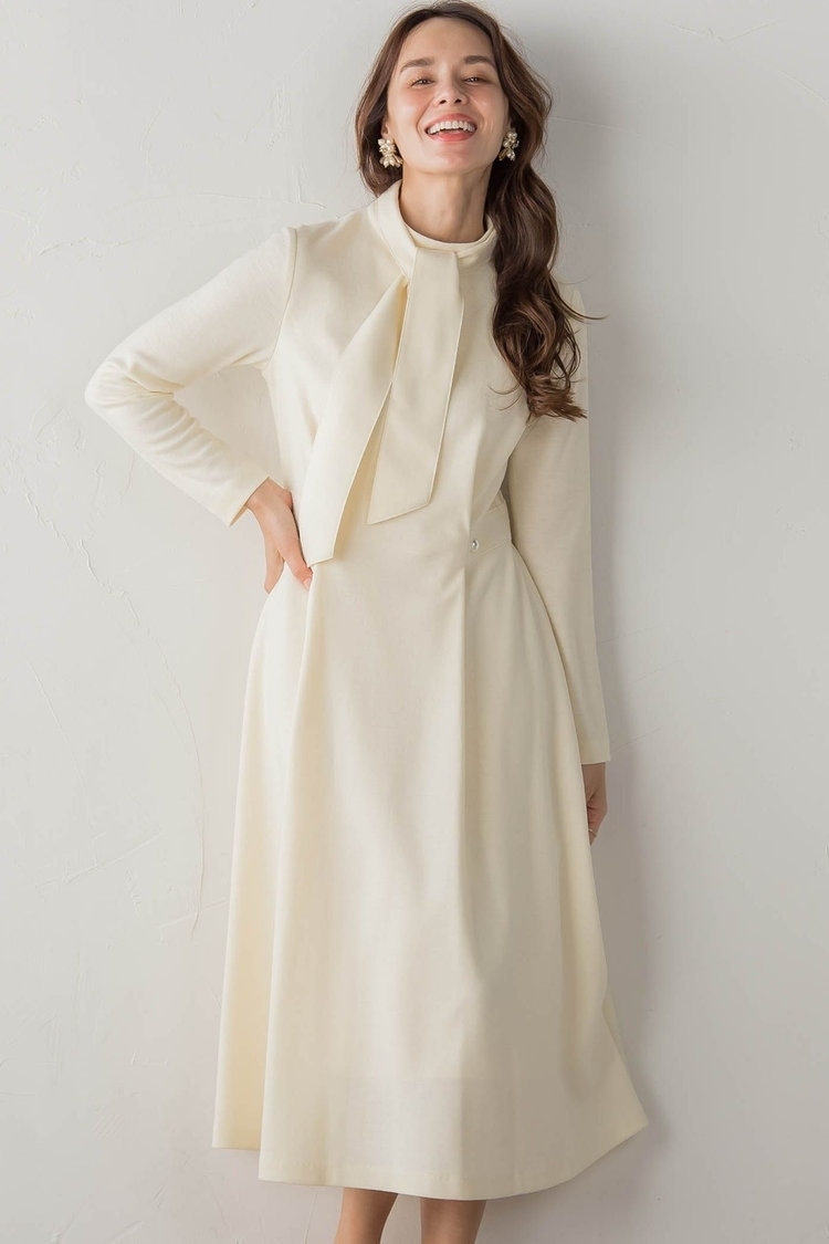 冬の特別なお出かけには、エレガントなワンピースがおすすめ。フィット&フレアのシルエットがフェミニンなワンピースは、胸元のボウタイデザインがクラシカルな雰囲気たっぷり。やわらかなオフホワイトは、大人の女性の持つ美しさ、優美さを引き出してくれます。女性らしさ満開のワンピースなので、合わせるアイテムもレディなものをチョイス。バッグはまろやかカラーで品よく、足元はキレイ色のパンプスで着こなしにアクセントをつけて。