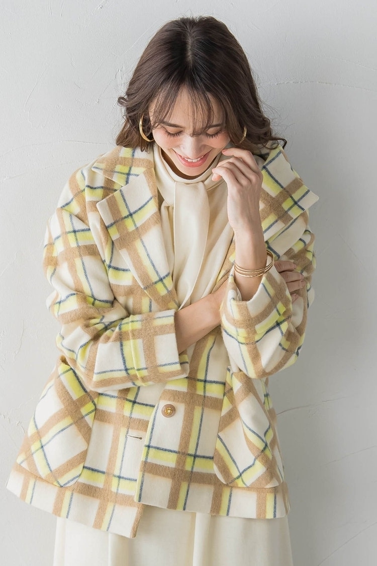ビッグチェックをループシャギーで表現した他にはないスペシャルなテーラードジャケットは、この冬大注目のアウター。大人の女性らしいスタイリングにしたいときは、同系色のニットワンピと合わせるのがおすすめ。一気にエレガントできちんとした印象のコーデに仕上がります。程よくドロップショルダーになった少しゆったりめのシルエットが抜け感と女っぽさを演出。足元はパンプスやブーツなどでレディに仕上げて。