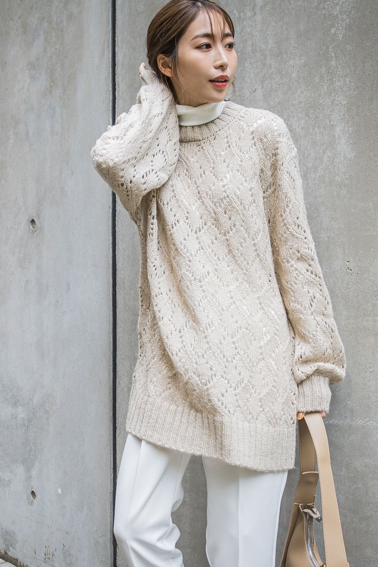 この冬注目したいのが、透かし柄の存在感たっぷりなニット。ざっくりとした編地やゆるっとしたシルエットが大人可愛く、シンプルなパンツと合わせるだけでこなれた印象の30代カジュアルコーデが楽しめます。おすすめはスキニーやスリムテーパードなど、きれいめな雰囲気のパンツ。ハイネックインナー&ボトムス&スニーカーを白でまとめ、ベージュのバッグでやわらかなアクセントをつければ、女性らしく優しい雰囲気のスタイリングに。