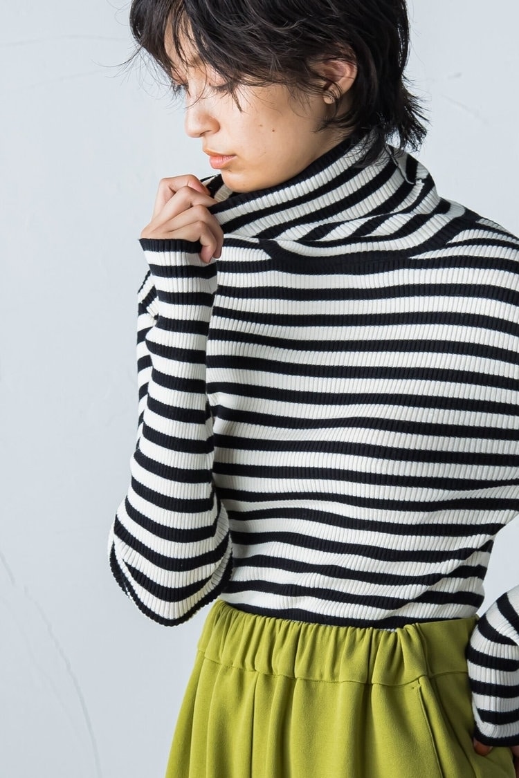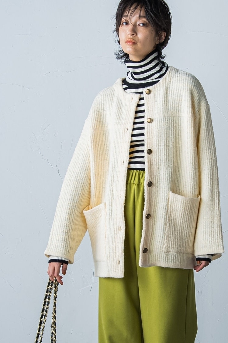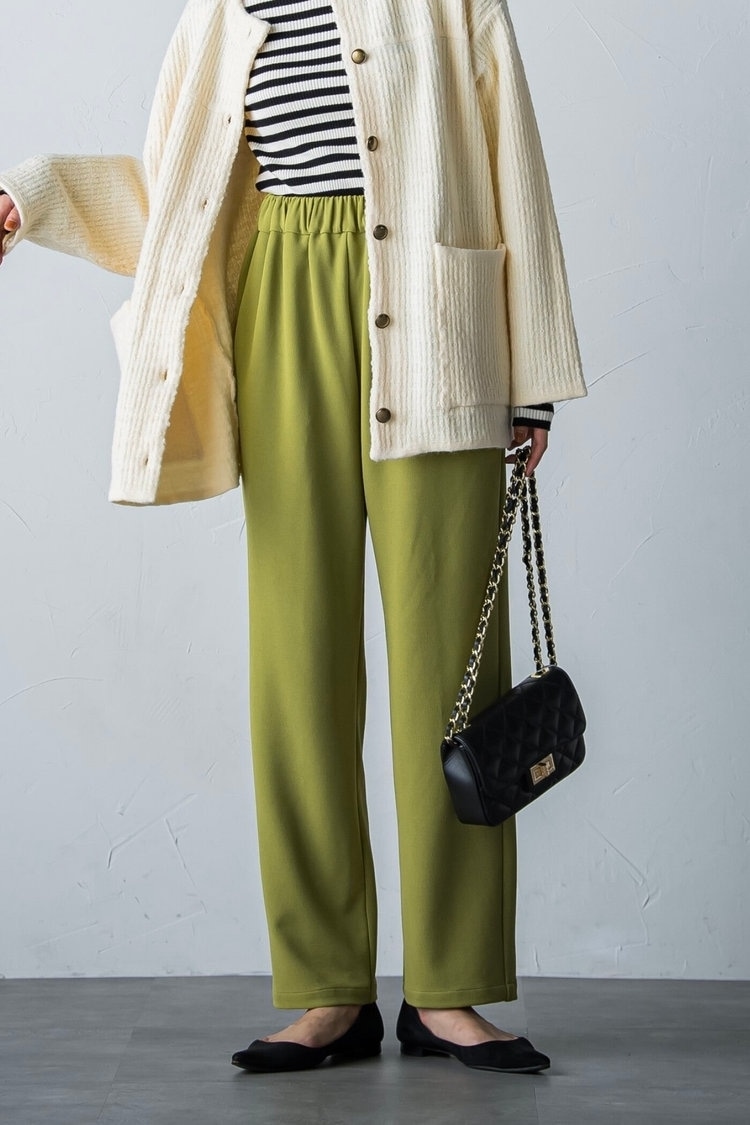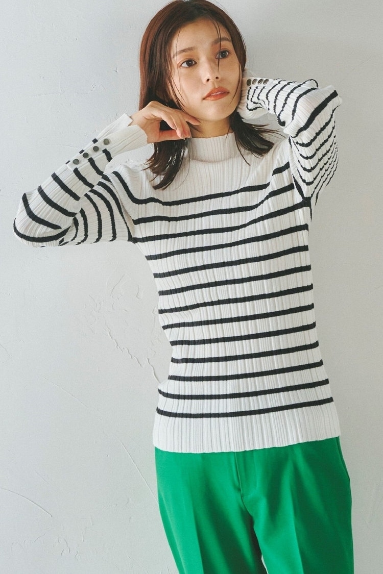 冬にマストなタートルネックニットも、ボーダーを選べば新鮮な気分。ボトムスにはノンストレスで履けるグリーンのワイドパンツを合わせ、コーデのアクセントに。トレンドのツイード風ニットカーディガンをサッと羽織れば、リラクシーな雰囲気ながらもおしゃれなスタイリングが完成。動きやすく快適に過ごせるから、デイリーや旅行にもおすすめ。だらしなく見えないよう、小物類はパンプス&レザーキルティングバッグでかっちりとまとめるのがコツ。