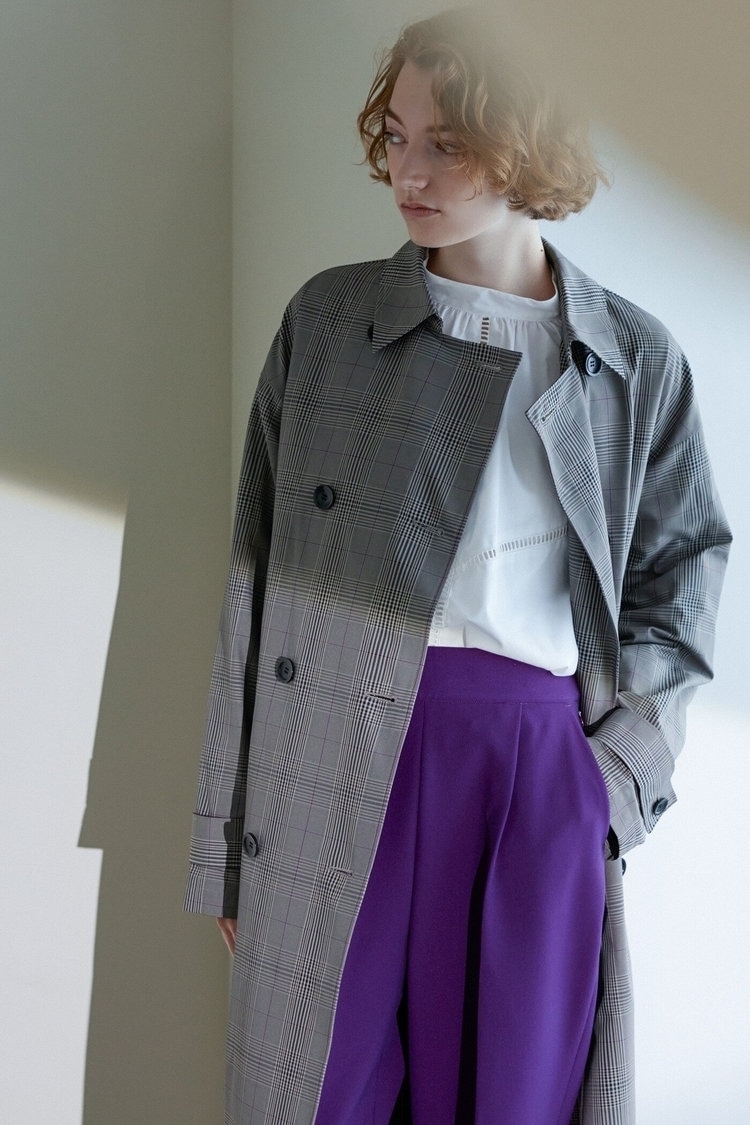 30代女性のワードローブにあると便利なのが、トレンチコート。きれいめからカジュアルまでどんなスタイリングにも合わせやすく、羽織るだけで上品な雰囲気をまとえます。ベージュやネイビーが定番だけれど、今年はクラシカルな雰囲気のチェック柄がイチ押し。中綿のライナー付きなので寒い時期でも暖かく着られます。野暮ったくならないよう、ホワイトのデザインブラウス&パープルのカラーテーパードパンツを合わせ、抜け感を出して。