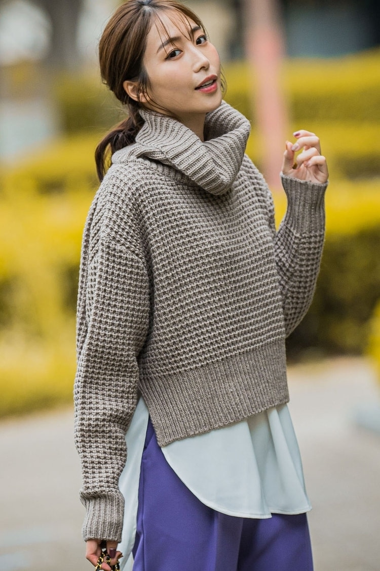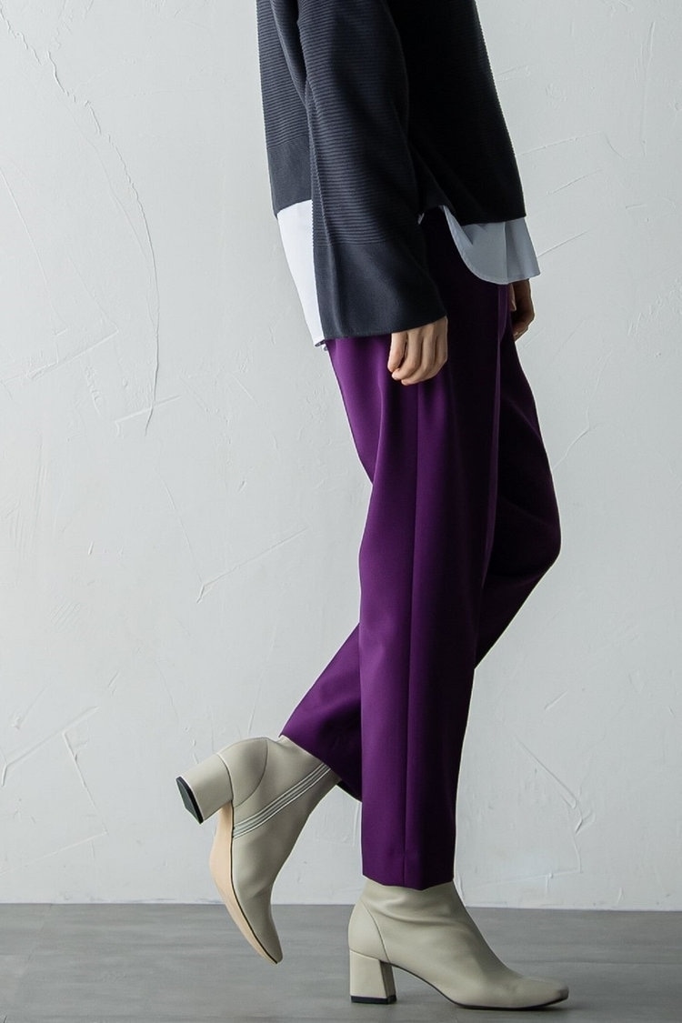 濃いめのラベンダーカラーともいえる“ベリーペリー”色は、2022年冬のトレンドカラー。テーパードパンツで取り入れれば、一気に旬のスタイリングへと変化します。パンツはきれいめな雰囲気なのにウエストゴム仕様で、動きやすくラクに履けるのもうれしいポイント。トップスには、ワッフル編みがかわいいオフタートルニット&白のカットソーをレイヤードして。ブラウンのブーツを合わせれば、大人っぽく上品な冬の30代コーデが完成します。
