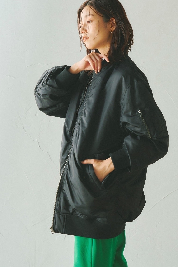 ミリタリーテイストで辛口な雰囲気が魅力のMA-1は、着回しが効きカジュアルコーデでも活躍してくれるアウター。大人っぽく着こなしたいときは、黒のMA-1をチョイスしてみて。パネルボーダーのタイトなリブニット、グリーンのカラーパンツを合わせれば、トレンド感たっぷりのスタイリングに。MA-1にボリュームがある分、インナーやボトムスはコンパクトにまとめることで、着ぶくれせずすっきりとした冬コーデが楽しめます。