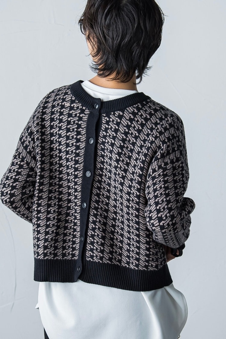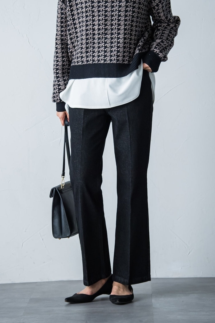 レトロなジャガードニットは2022年冬も引き続き注目のアイテム。30代女性がスタイリッシュに着こなすなら、黒のデニムフレアパンツを合わせるのがおすすめ。デニムながらもセンタープレス入りできれいめに着られるうえ、フレアシルエットで美脚効果もばつぐん。ニットの下には白のカットソーをレイヤードし、抜け感を出すのがおしゃれ見えのコツです。フラットパンプスやバッグも黒で統一し、ちょっぴりモードな雰囲気に仕上げてみて。