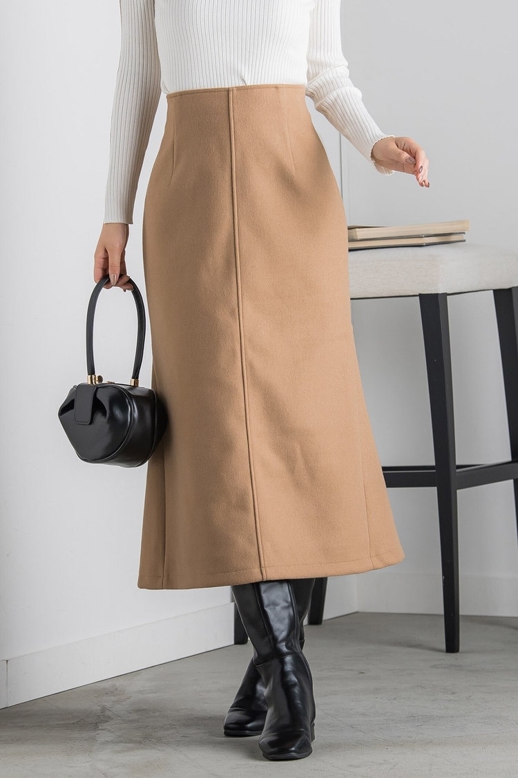 冬の大人コーデには、ウールライクなメルトン生地を使ったロングスカートで、季節感を演出するのがおすすめ。ゆるやかなマーメイドラインが美しく、ニットなどを合わせるだけでリッチなスタイリングが楽しめます。カジュアルに着こなしたいときは、キルティングジャケットを合わせるのが◎。目線を上に持っていきやすいショート丈を選ぶことで、スタイルアップして見せられます。ブーツ、バッグはジャケットと同じ黒で統一し、シックに仕上げて。