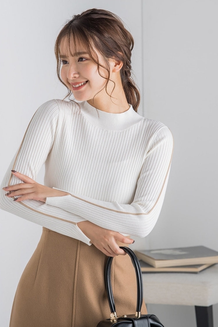 フェミニン派におすすめなのが、きちんと見えするきれいめニット。袖口のパールデザインで、エレガントな雰囲気のスタイリングに仕上がります。トレンドを意識するなら、人気のマーメイドスカートを合わせるのが◎。落ち着いた色のニットに明るい色のスカートで、華やかかつ、清潔感たっぷりの冬コーデに。ニットはINするとスタイルアップ見えが叶います。かっちりめのバッグ&パンプス合わせで、つま先までとことんエレガントに仕上げて。