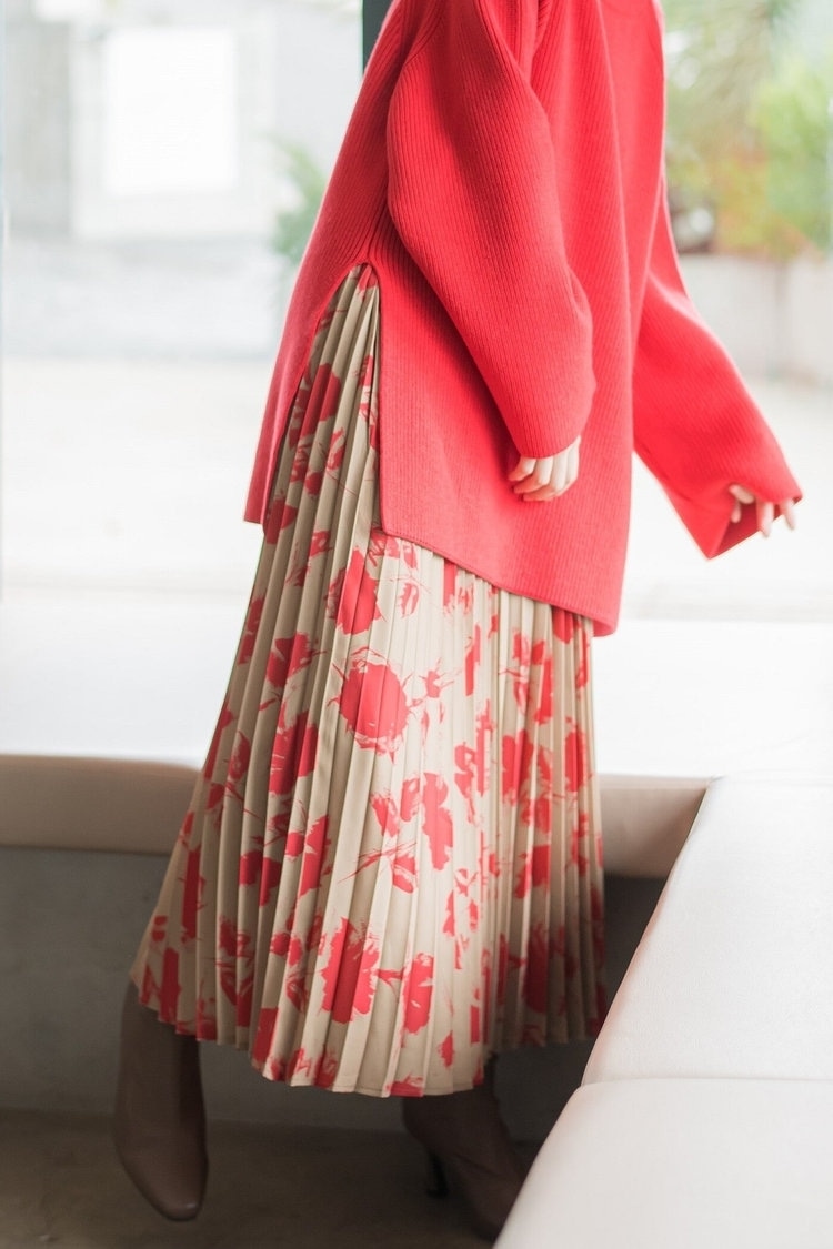 女友達同士でワイワイ楽しむ女子会では、「自分らしさも出しつつ、おしゃれに見られたい!」という人も多いはず。そんなときは、トレンドのカラーニット×花柄プリーツスカートで華やかなスタイリングに仕上げてみて。ニットは鮮やかなレッドカラーやざっくり感、ワイドスリーブがおしゃれな印象。スカートの柄はトップスの色とリンクさせることで、華やかながらも統一感のある冬コーデに仕上がります。足元はグレーのストレッチブーツですっきりとまとめて。