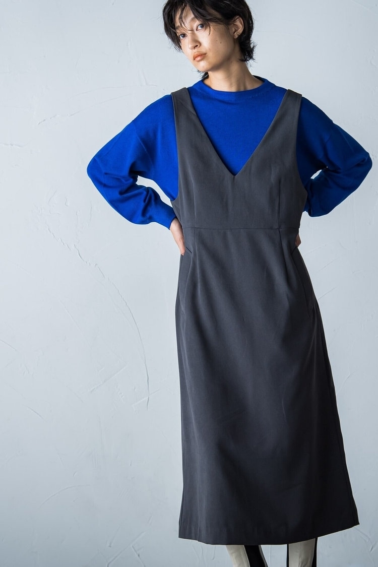 今季注目のツイード素材は、上品でクラシカルな雰囲気が30代女性にもおすすめ。これからワードローブに加えるなら、ぜひジャンパースカートで取り入れてみて。身頃はストンとしたIライン、裾の近くでティアードシルエットに切り替えているので、甘すぎず子どもっぽくならないのが◎。深めのVネック仕立てで、大人っぽさと女性らしさを纏えます。インナーにはブルーのリブニットを合わせ、今年らしいカラーコーデを楽しんでみて。
