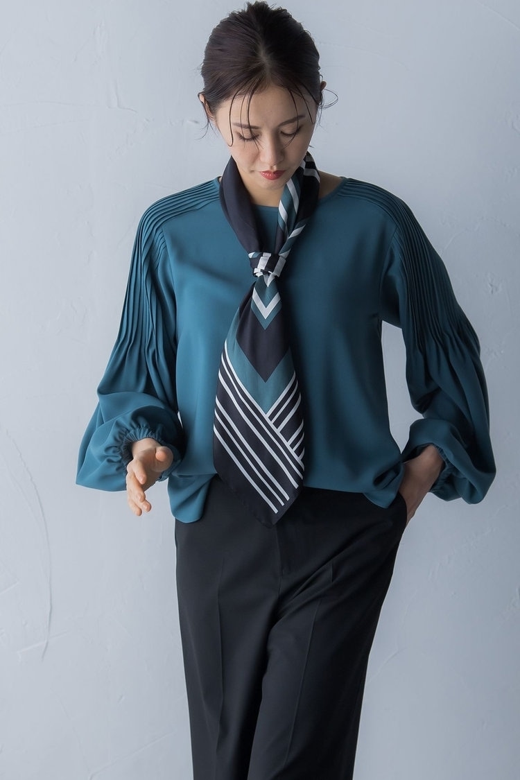 コーデがシンプルすぎる……というときこそ試してほしいのが、スカーフを取り入れる方法。首元に巻くのはもちろん、結んだ髪に巻いてヘアアクセにしたり、バッグの持ち手に結んだりするだけで、一気に華やかなスタイリングへと格上げできます。特に本格的なモチーフ柄のスカーフは、30代の大人だからこそ似合うアイテム。きちんと感もありオンオフ問わず使えて、暗くなりがちな冬コーデでは特に活躍するので、1枚持っていて損はありません。