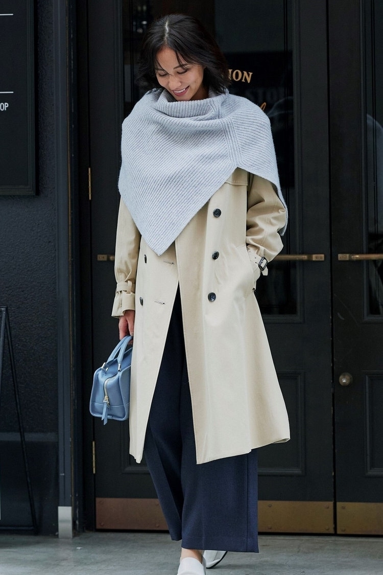 定番のトレンチコートはチェック柄で今年らしい表情に