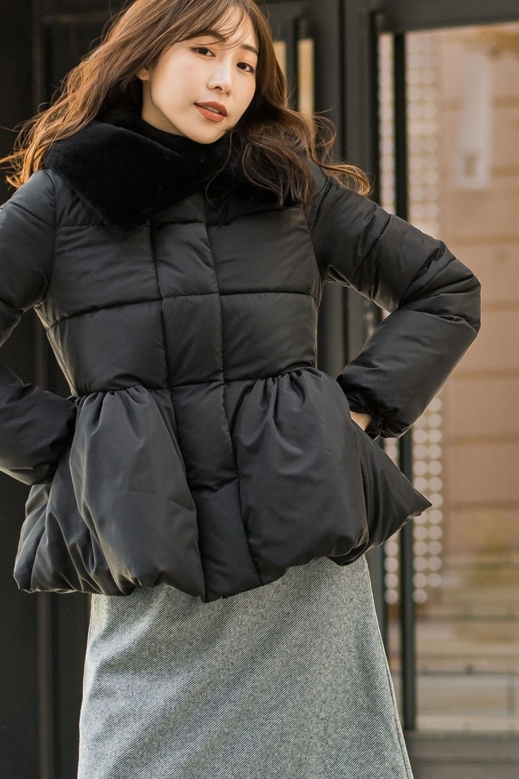 寒さ対策に必要なダウンも大人可愛くみせないなら、ペプラムシルエットのデザインのダウンがおすすめ。コンパクトなシルエットで着ぶくれせずにスマートに着こなせます。アウターの中は、すっきりとしたVネックラインのジャンスカコーデで今年らしく。手持ちのシンプルなニットとも合わせやすいので、着まわしの幅も広がります。