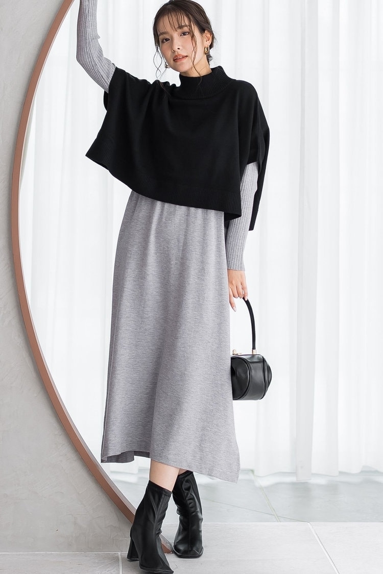 今季じわじわ人気に火がついているケープニットをつかったコーデ。ケープデザインは華やかさを添えてくれるだけでなく、肩や二の腕周りのカバー効果も◎。デイリーコーデの幅を広げたいなら、ケープニットとニットワンピースのセットアイテムがおすすめ。ブーツと合わせれば、シンプルながらもこだわりの詰まった大人フェミニンコーデの完成。ワントーンのコーデの場合は、バッグなど小物で違う色をプラスしてみて。
