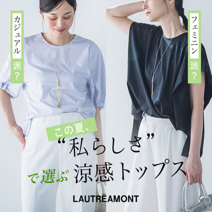 ふんわりと広がるシルエットと、ギャザーが生むやさしいドレープ。ほのかな透け感が、涼やかさと大人の余裕を感じさせます。