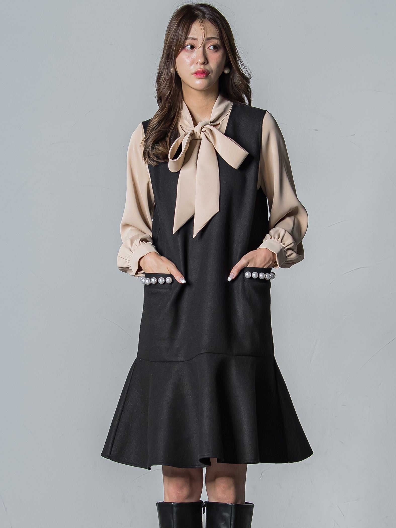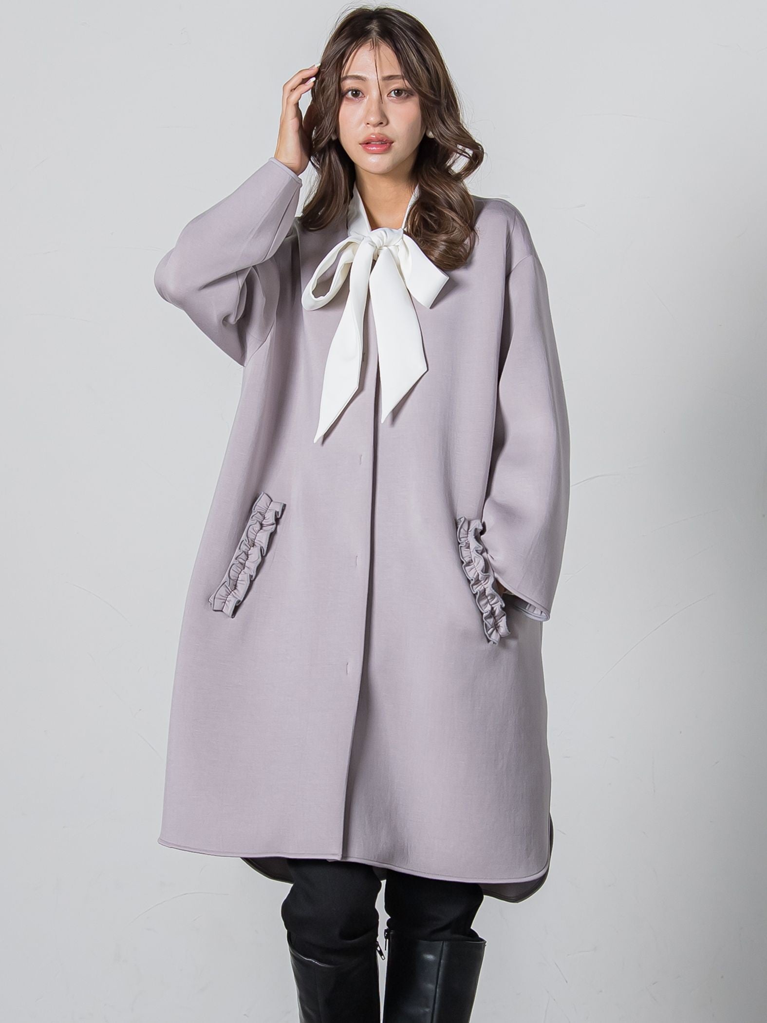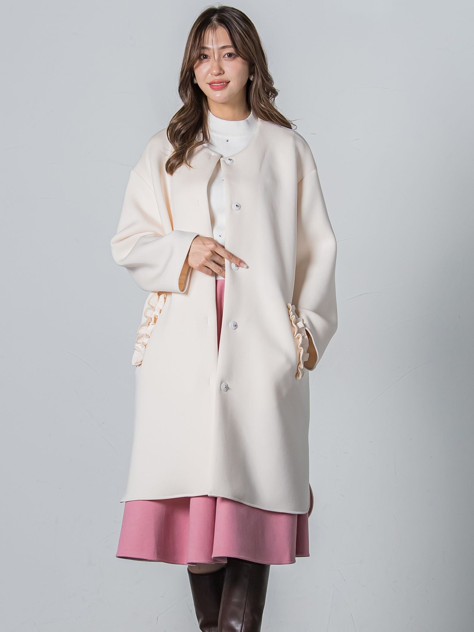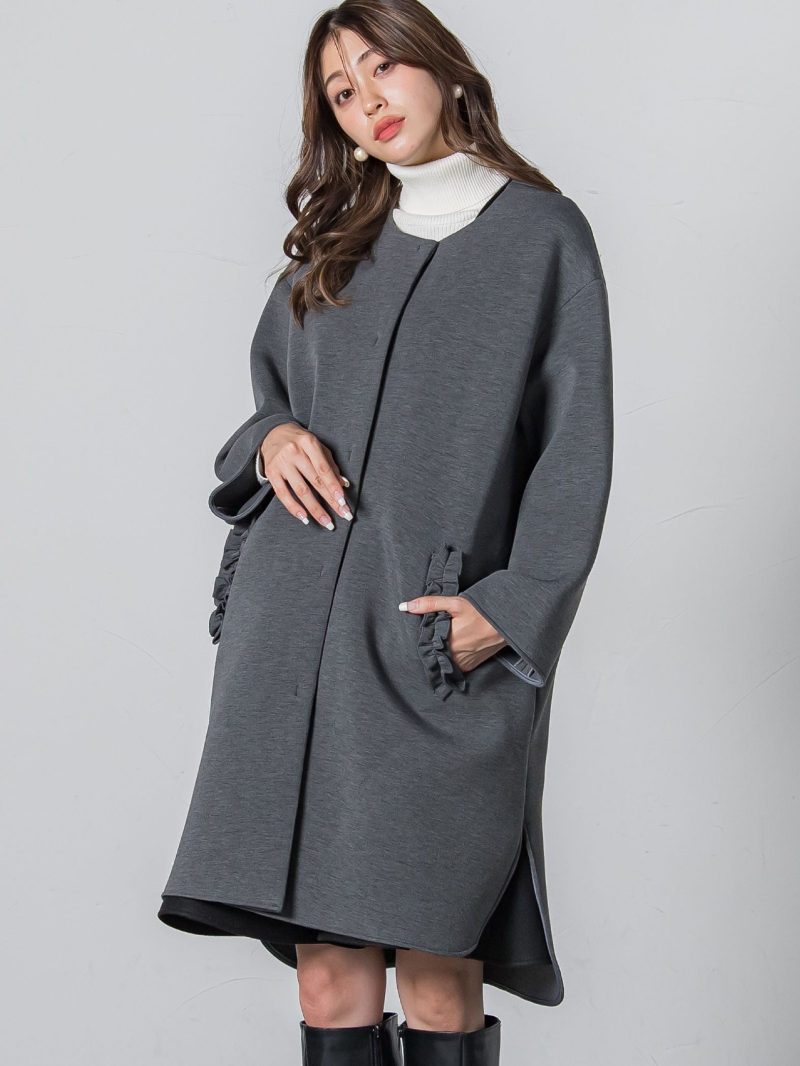 ノーカラーなので、ハイネックやフリル襟、ボウタイデザインのインナー等どんなインナーとも合わせやすいのが嬉しいポイント!