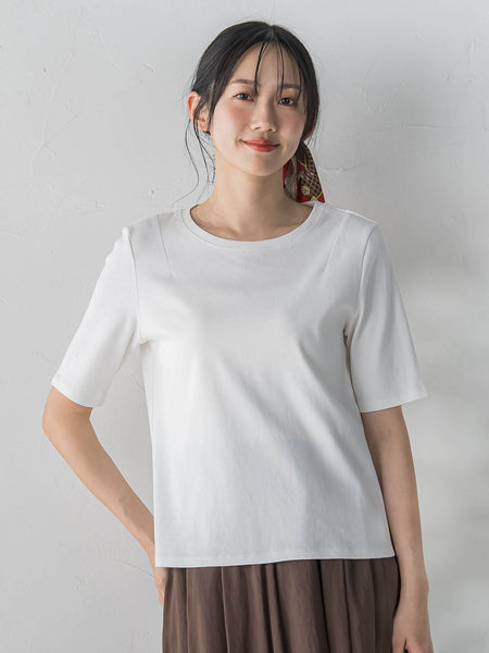 詰まったクルーネックが苦手な方にもおすすめしたい、ほどよい抜け感があるこだわりの衿ぐり。肩幅が大きく見えない絶妙なセットインハーフスリーブです。二の腕カバーが叶う5分袖でキレイ目な印象に仕上げ、背中の切替えが程よいアクセントに。フラットな天竺ではなく、ほどよい凹凸感のあるフライス生地を使うことで、よりストレッチの効いた快適な着心地。カジュアルなTシャツとしてはもちろん、ジャケットのインナーとしてキレイ目シーンでも活躍します。【素材の特徴】希少価値が高い超長綿をブレンドした、しなやかで肌あたりがなめらかなコットン素材。ハイゲージで編み立て、ナチュラルながらも上品な光沢感を実現。糸に加工を加えることで、洗濯後の毛羽立ちを極限まで抑えた耐久性も魅力のひとつ。【素材の特徴】・接触冷感 ----------------------------------------------------------------洗濯方法家庭洗濯:液温は40℃を限度とし、洗濯機で弱い洗濯ができる。自然乾燥:日蔭の吊り干しがよい。アイロン:底面温度160℃を限度としてアイロン仕上げができる。ドライクリーニング:石油系溶剤による弱いドライクリーニングができる。----------------------------------------------------------------※画像の商品はサンプルとなりますので実際の商品と仕様、加工、サイズが若干異なる場合がございます。※お客様のモニター環境により実際のお色と多少異なる場合がございます。※撮影状況や光の当たり具合により、色合いが異なって見える場合がございます。※商品タグに記載されたサイズはヌードサイズです。実際の商品のサイズは商品情報の実寸をご確認ください。関連ワード:Droitelautreamont ドロワットロートレアモン レディース 新作 トレンド 大人フェミニン 2026春夏 2026SS 春夏 春物 春服 カットソー コットン 無地 五分袖