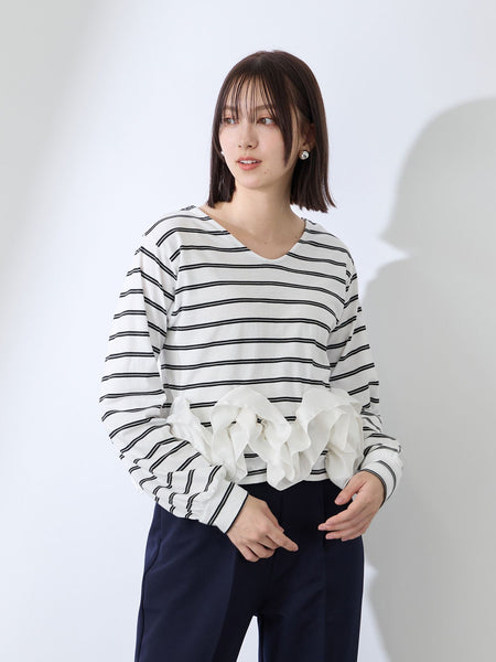 ●POINTボディ部分を程よい肉感のジャージー素材、裾部分を布帛でリズミカルな大ぶりのフリルデザインで切替えたクロップドプルオーバーです。フリルを構築的にすることで、どの角度から見てもの立体的で存在感があり、新鮮な表情を見せます。ウエストラインにボリュームがくるように設定した短めの着丈で、ハイウエストのスカートやワイドパンツとの着合わせていただくとスタイルアップなバランスでご着用いただけます。また、デニムなどのカジュアルボトムなどにあわせたカジュアルミックスなスタイルもおすすめです。----------------------------------透け感:淡色のみややあり厚さ: やや厚い伸縮性:あり裏地: なしポケット: なし----------------------------------■モデル身長 165cm 着用サイズ M※画像の商品はサンプルとなりますので実際の商品と仕様、加工、サイズが若干異なる場合がございます。※お客様のモニター環境により実際のお色と多少異なる場合がございます。※撮影状況や光の当たり具合により、色合いが異なって見える場合がございます。関連ワード:QUEENS COURT クイーンズコート レディース 新作 フェミニン 大人コーデ 2026春夏 2026SS 春夏 春物 春服 カットソー コットン ポリエステル ミニ丈・ショート丈 クルーネック 長袖