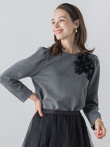 立体感のあるフラワーモチーフはサテンとシフォンの2タイプをミックスし表情感のあるムードに仕上げています。