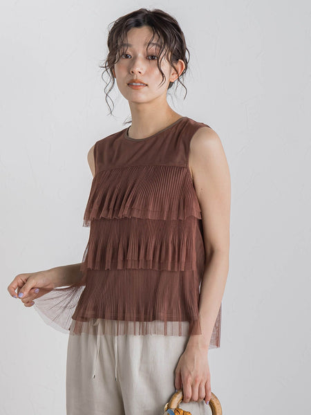 【デザインポイント・着こなしポイント】シアー感のあるチュールプリーツを重ねた軽やかなティアードブラウス。着るだけで華やかな印象に仕上げてくれます。1枚ではもちろん、上にも羽織りやすい程良い肩幅のノースリーブです。伸縮のある裏地付きで、ストレスフリーかつ透け感も気にせず着用していただけます。----------------------------------------------------------------洗濯方法家庭洗濯:液温は40℃を限度とし、手洗いができる。自然乾燥:日蔭の吊り干しがよい。アイロン:底面温度160℃を限度としてアイロン仕上げができる。ドライクリーニング:石油系溶剤による弱いドライクリーニングができる。----------------------------------------------------------------※画像の商品はサンプルとなりますので実際の商品と仕様、加工、サイズが若干異なる場合がございます。※お客様のモニター環境により実際のお色と多少異なる場合がございます。※撮影状況や光の当たり具合により、色合いが異なって見える場合がございます。※商品タグに記載されたサイズはヌードサイズです。実際の商品のサイズは商品情報の実寸をご確認ください。関連ワード:Droitelautreamont ドロワットロートレアモン レディース 新作 トレンド 大人フェミニン 2025春夏 2025SS 春夏 夏物 夏服 ティアード ブラウス シアー チュール プリーツ ストレスフリー