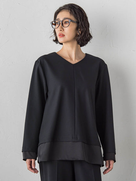 【デザインの特徴】ふんわりとした両面起毛素材に、裾のサテン切り替えがさりげない華やかさを添える一枚。軽やかな光沢が、ニットやウールの季節に上品な抜け感をプラスします。顔まわりをすっきり見せるVネックに、体のラインを拾いにくいIラインシルエット。カジュアルにもきれいめにも馴染むデザインで、ジャケットインにもおすすめです。冬の装いに“ほどよい艶”を取り入れて、大人の余裕を感じさせるスタイリングに。【機能性】◆Easy Careご自宅でのお手入れが簡単◆2WAYストレッチ◆吸水速乾【素材の特徴】梳毛のようなメランジカラーととろけそうなパウダータッチ、まるでニットのような優しくてリラックス出来る着心地を実現したポリエステル100%の国産素材になります。イージーケア性はもちろん2WAYストレッチで吸水速乾性にも優れ、サラッとした落ち感で大人の女性にピッタリな素材感となっております。----------------------------------------------------------------洗濯方法家庭洗濯:液温は30℃を限度とし、洗濯機で非常に弱い洗濯ができる。自然乾燥:日陰の吊り干しがよい。アイロン:底面温度120℃を限度としてアイロン仕上げができる。ドライクリーニング:石油系溶剤による弱いドライクリーニングができる。----------------------------------------------------------------※画像の商品はサンプルとなりますので実際の商品と仕様、加工、サイズが若干異なる場合がございます。※お客様のモニター環境により実際のお色と多少異なる場合がございます。※撮影状況や光の当たり具合により、色合いが異なって見える場合がございます。※商品タグに記載されたサイズはヌードサイズです。実際の商品のサイズは商品情報の実寸をご確認ください。関連ワード:la.f… ラ エフ レディース 新作 大人コーデ シンプル フォーマル モード マニッシュ 2025秋冬 2025AW 秋冬 秋物 秋服
