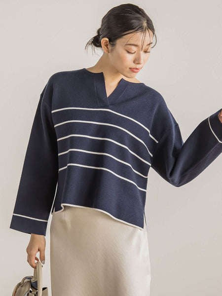 【デザインポイント・着こなしポイント】スリットネックのデザインが女性らしいニットプルオーバー。1枚ではもちろん、ゆったりとしたサイズ感でインナーにロンTなどを合わせてカジュアルなレイヤードスタイルも楽しめます。もっちりとした総針編みで安心感のある肉感に仕上げました。パネルボーダーやライン使いでコートインにも着映えする春に向けても活躍してくれる1枚です。----------------------------------洗濯方法家庭洗濯:液温は40℃を限度とし、手洗いが出来る。自然乾燥:日蔭の平干しが良い。アイロン:底面温度150℃を限度としてアイロン仕上げができる。ドライクリーニング:石油系溶剤による弱いドライクリーニングができる。----------------------------------※画像の商品はサンプルとなりますので実際の商品と仕様、加工、サイズが若干異なる場合がございます。※お客様のモニター環境により実際のお色と多少異なる場合がございます。※撮影状況や光の当たり具合により、色合いが異なって見える場合がございます。※商品タグに記載されたサイズはヌードサイズです。実際の商品のサイズは商品情報の実寸をご確認ください。関連ワード:Droitelautreamont ドロワットロートレアモン AW 2024秋冬 冬 冬服 WINTER 大人カジュアル ニット ポリエステル レーヨン ナイロン ボーダー 長袖